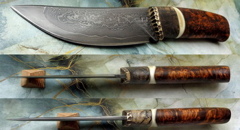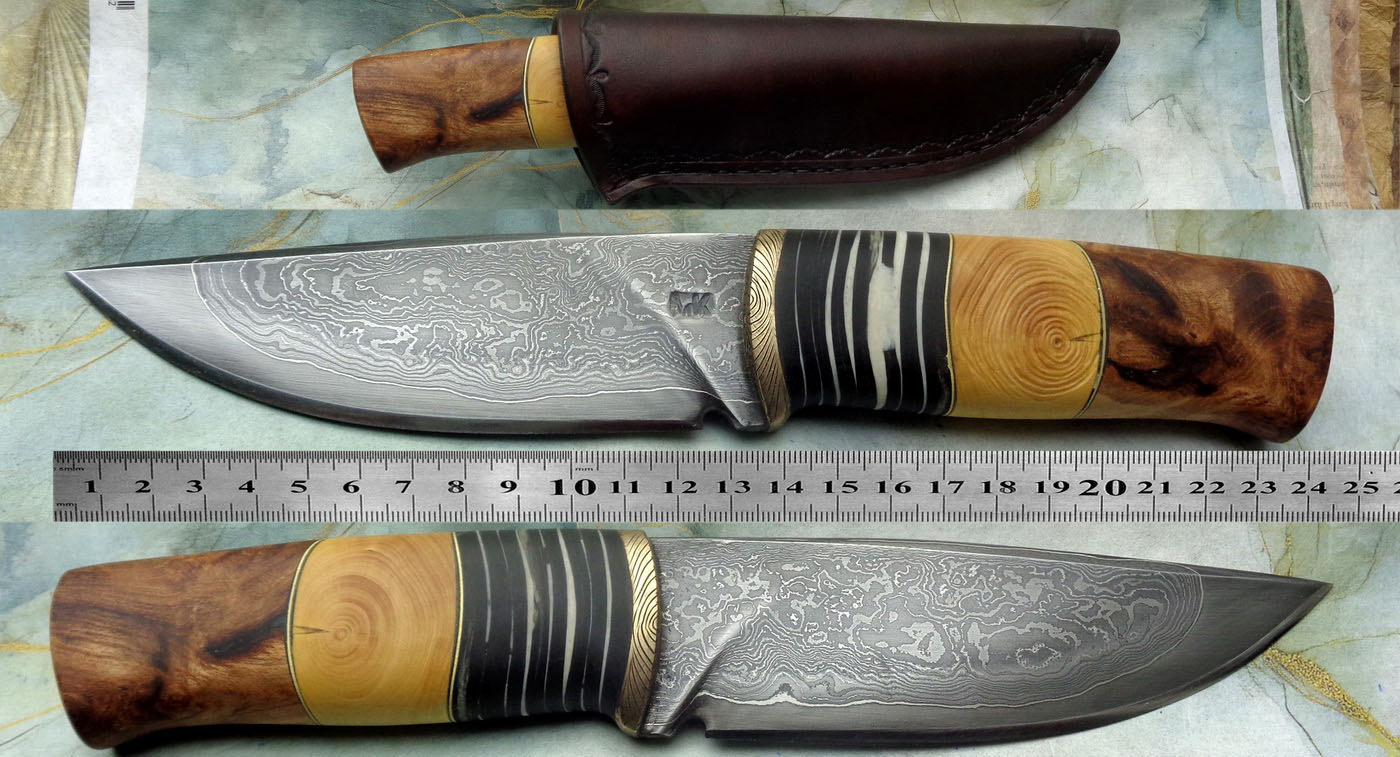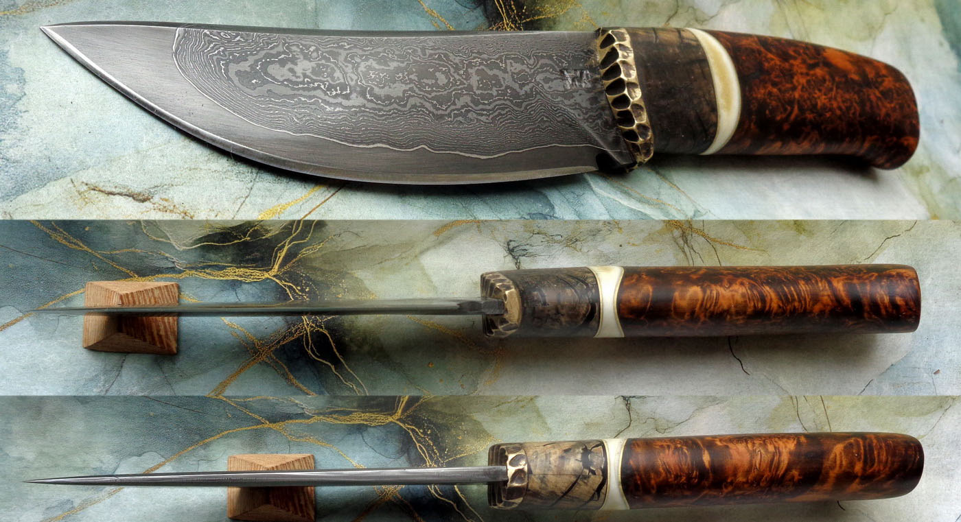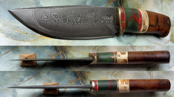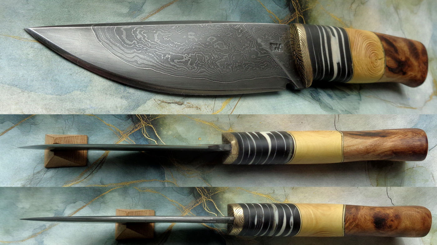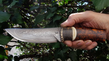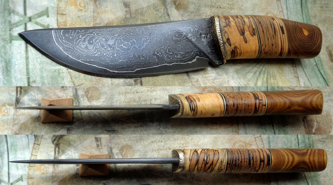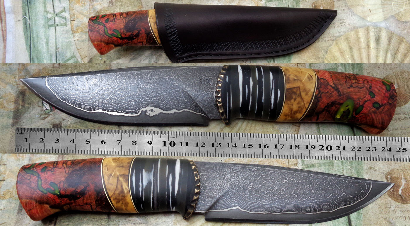 Острие – Мозайкова дамаска стомана. За режещ ръб съм спретнал див дамаск изкован от Шх15 и 75Ni8. Зоново калено с обмазка. 58-60 HRC.