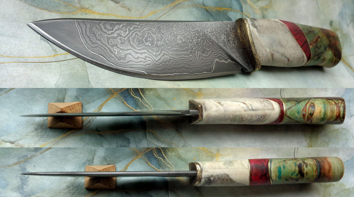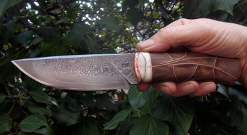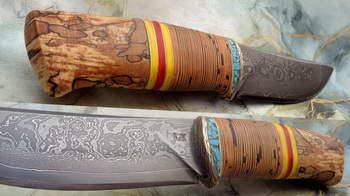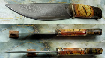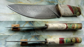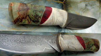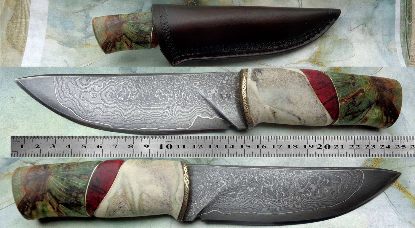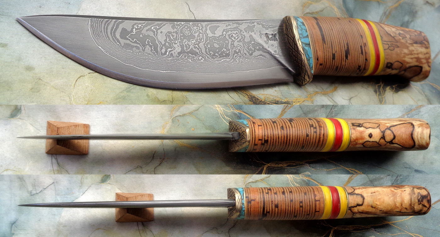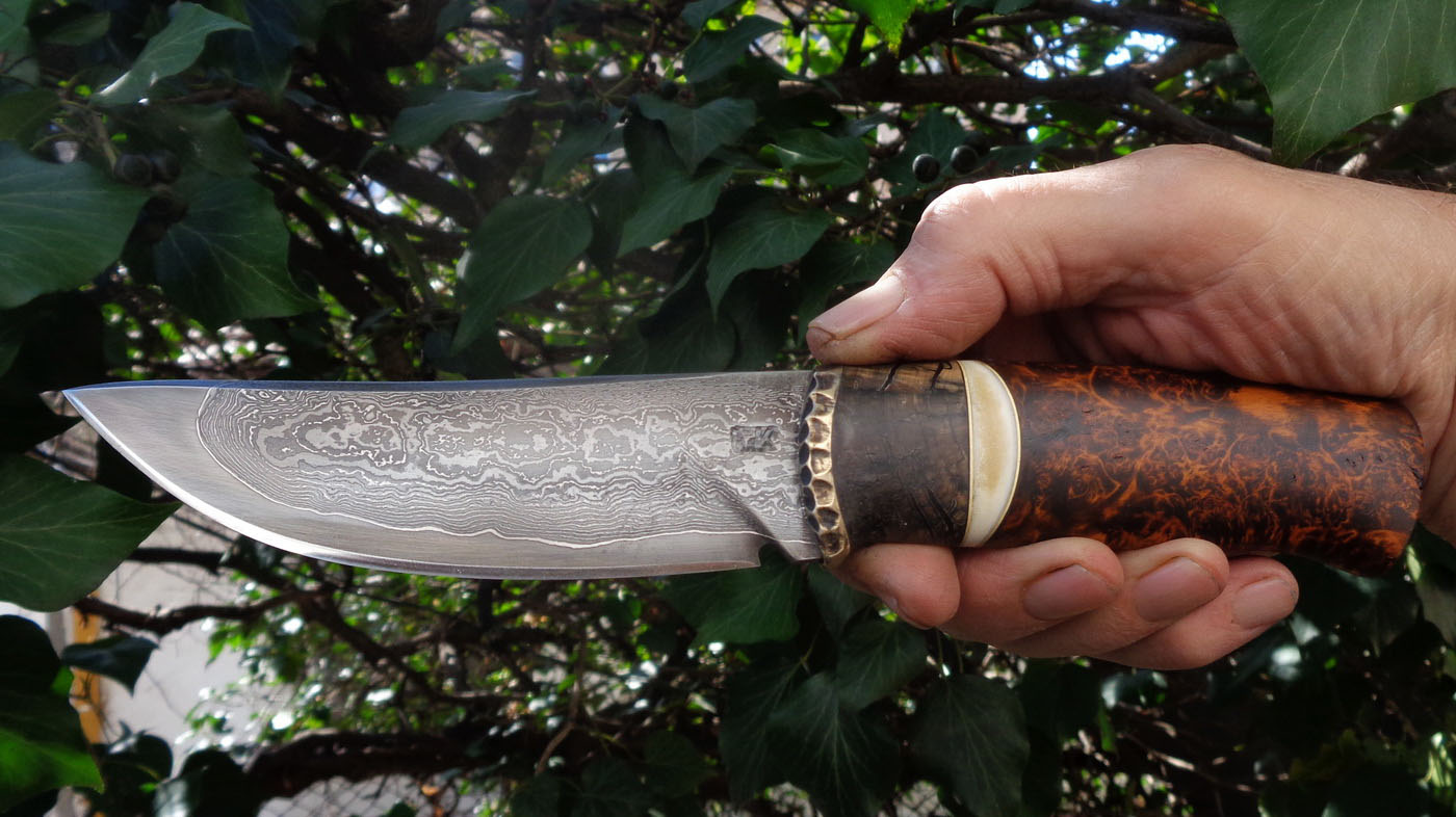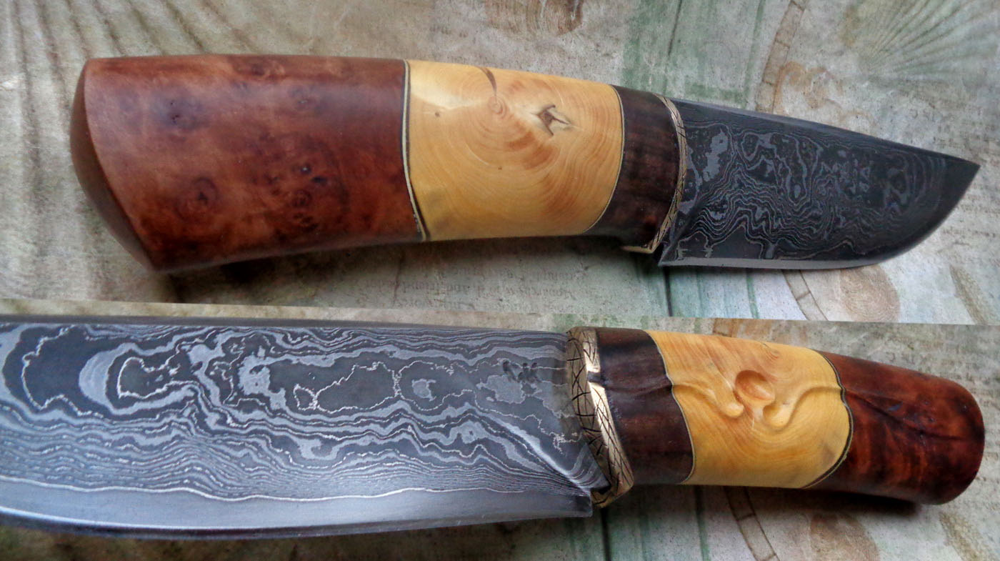 Острие – Мозайкова дамаска стомана. За режещ ръб съм спретнал див дамаск изкован от Шх15 и 75Ni8. Зоново калено с обмазка. 58-60 HRC.