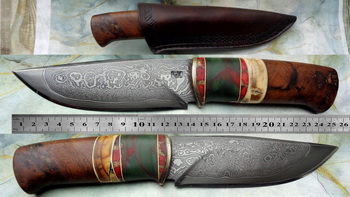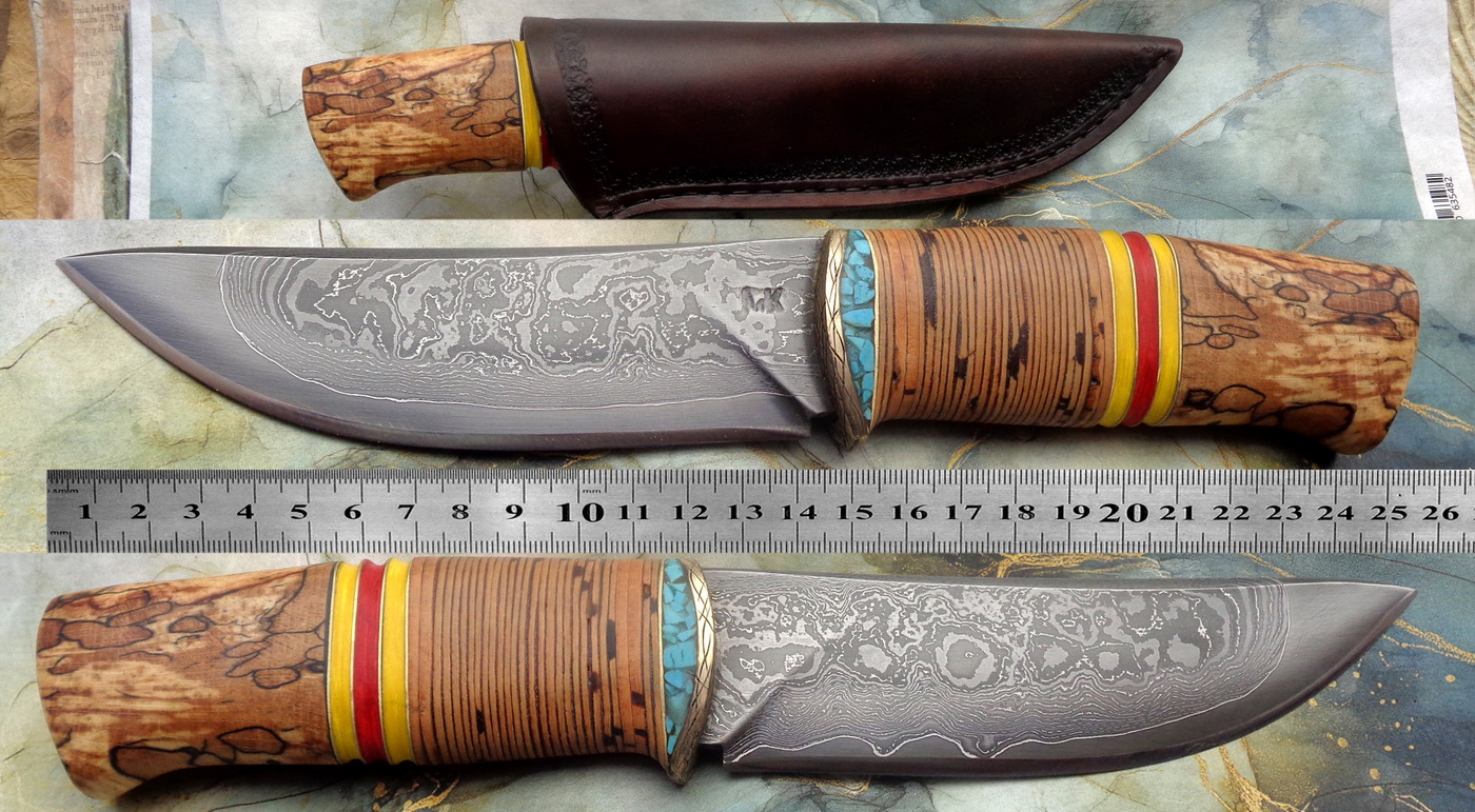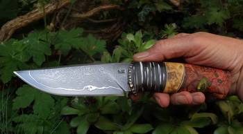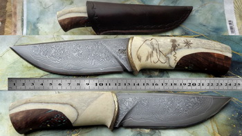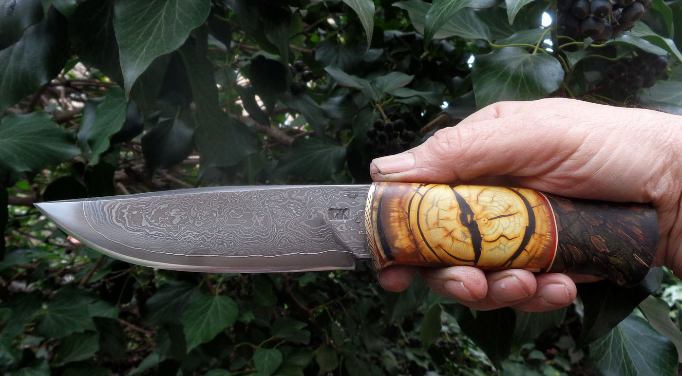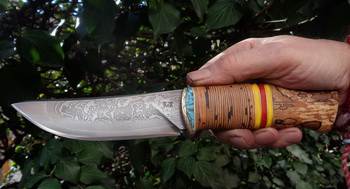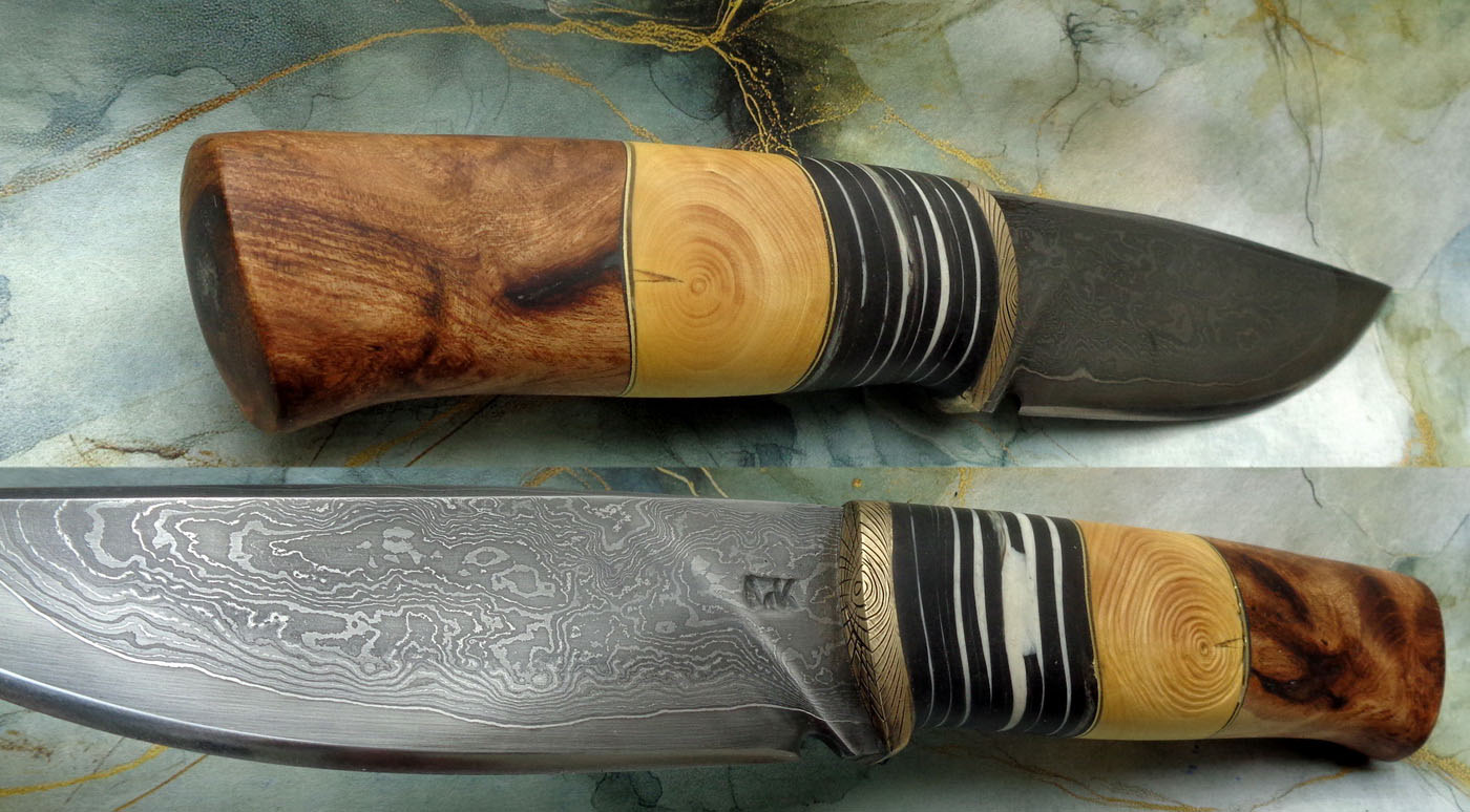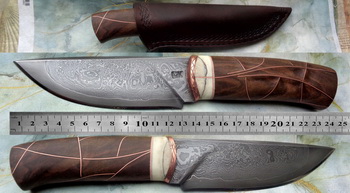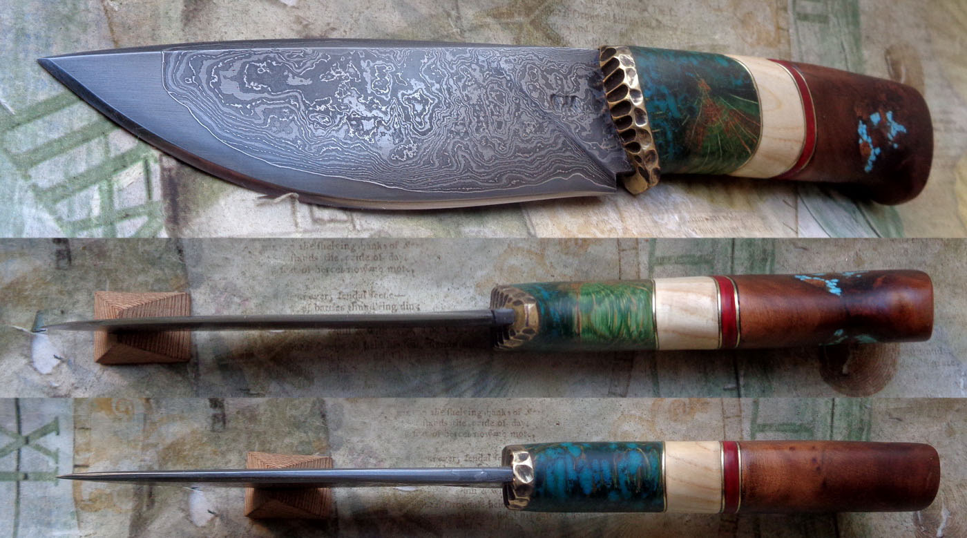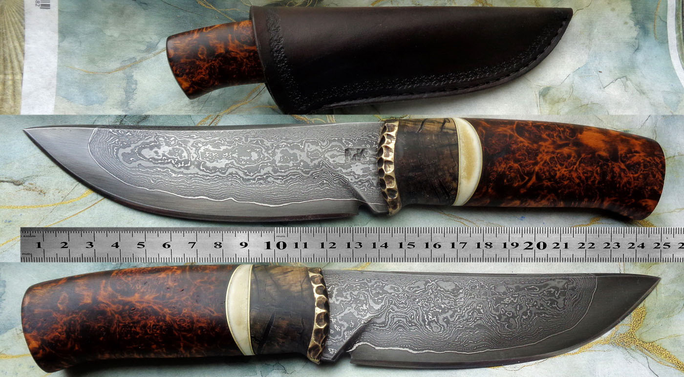 Острие – Мозайкова дамаска стомана. За режещ ръб съм спретнал див дамаск изкован от Шх15 и 75Ni8. Зоново калено с обмазка. 58-60 HRC.