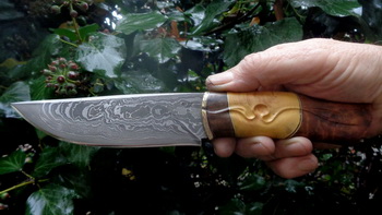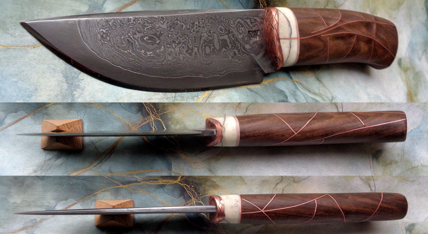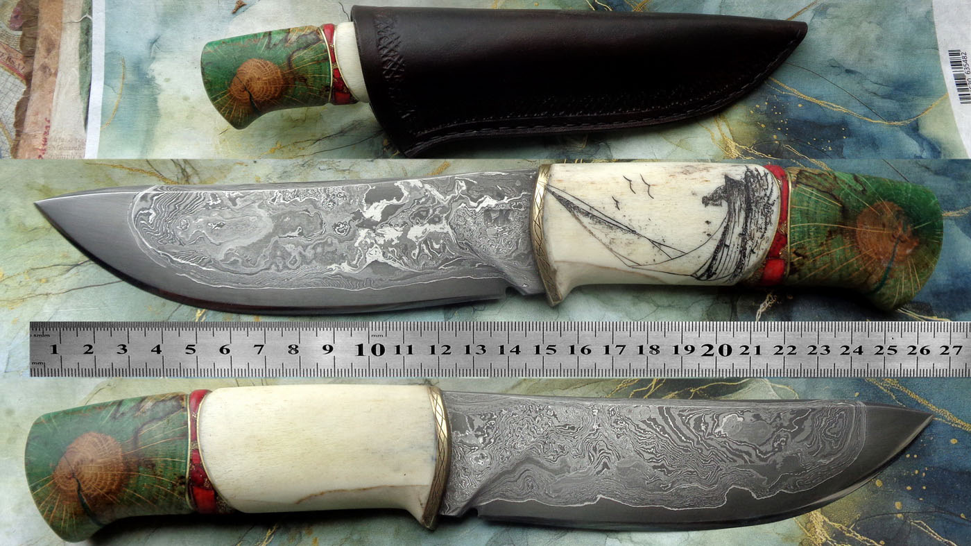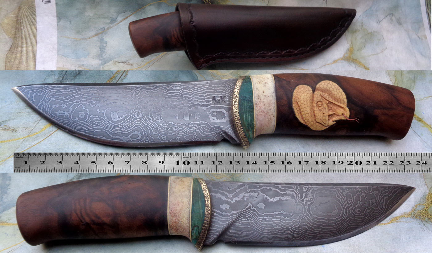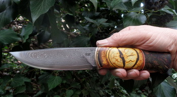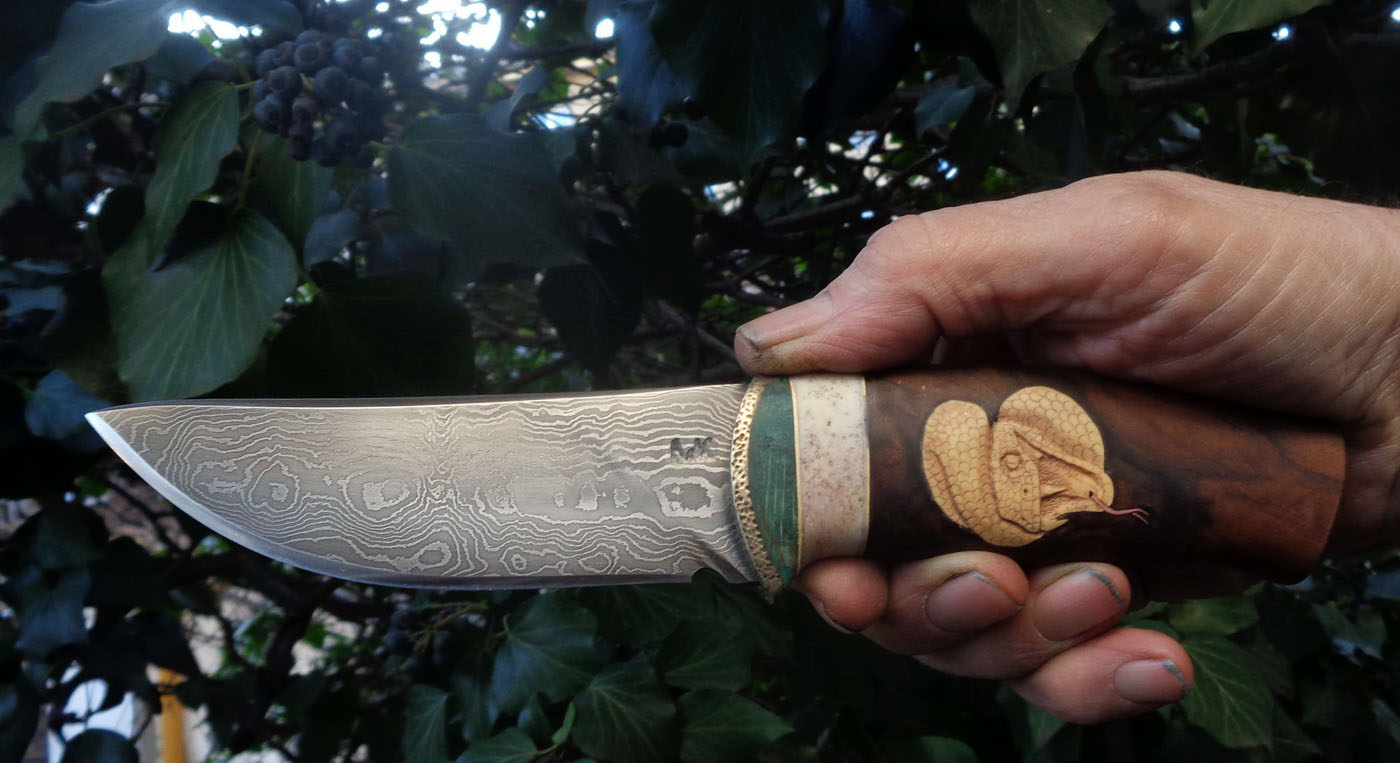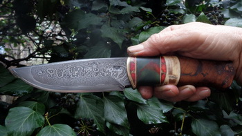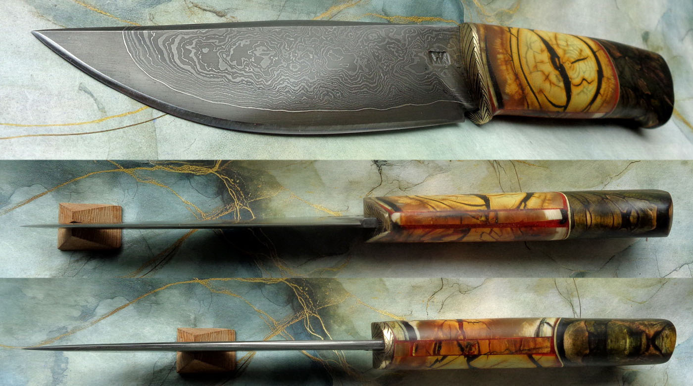 Острие – Мозайкова дамаска стомана. За режещ ръб съм спретнал див дамаск изкован от Шх15 и 75Ni8. Зоново калено с обмазка. 58-60 HRC.