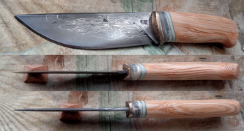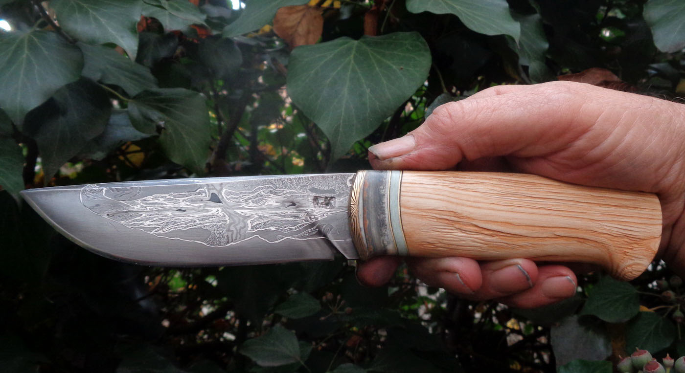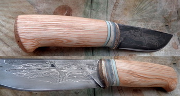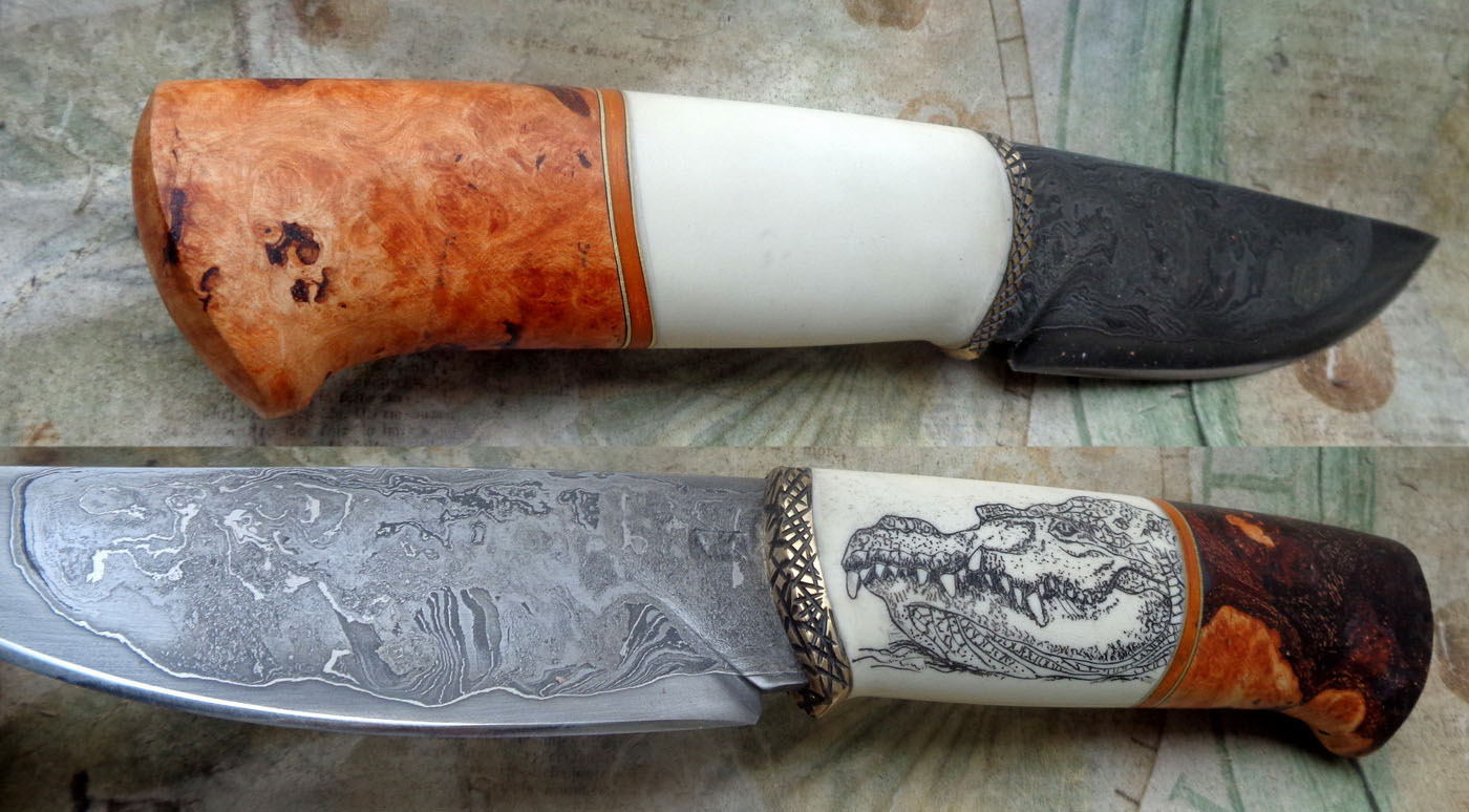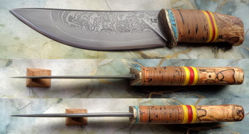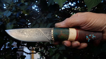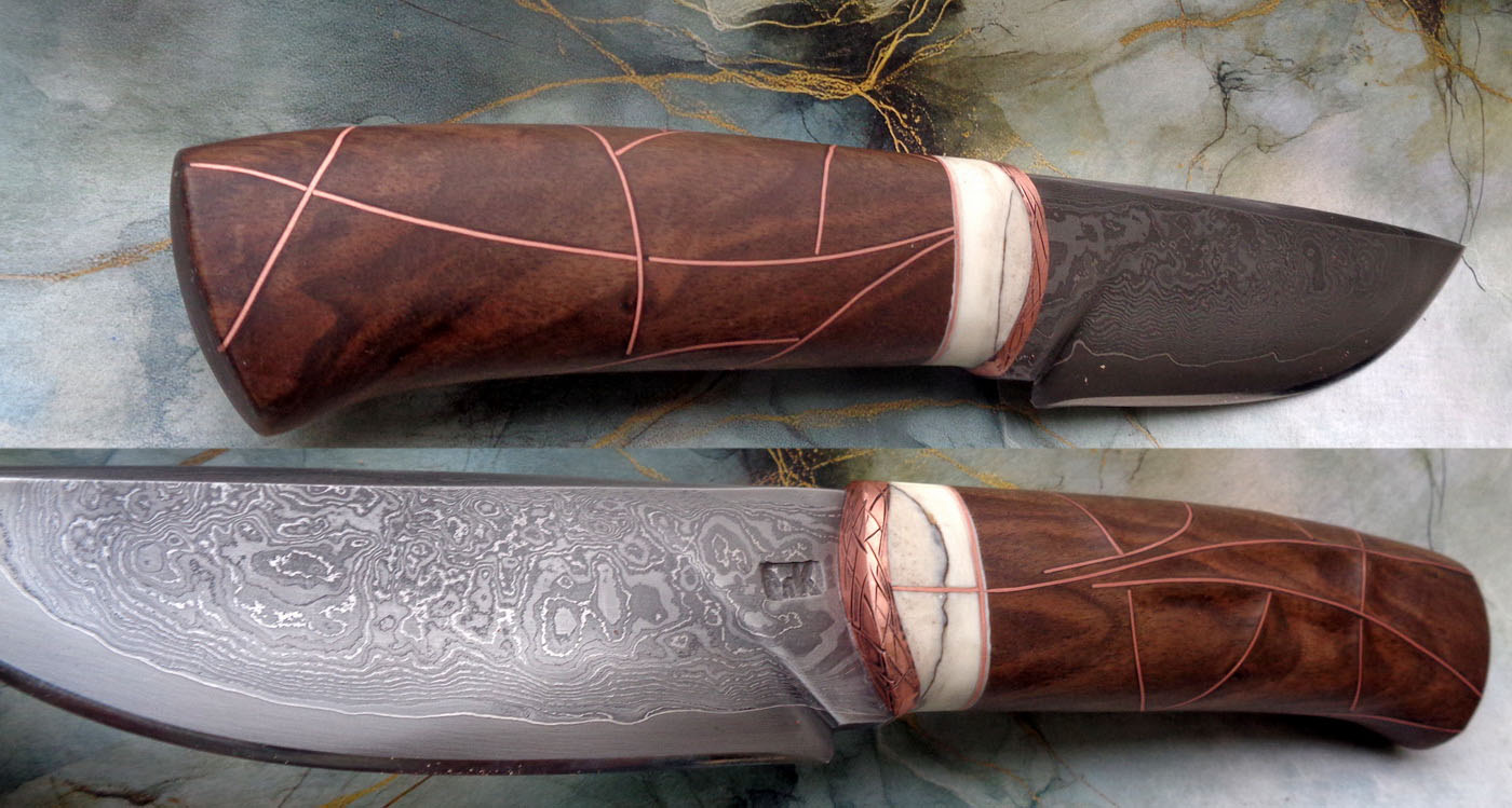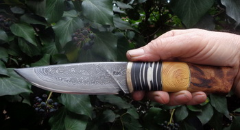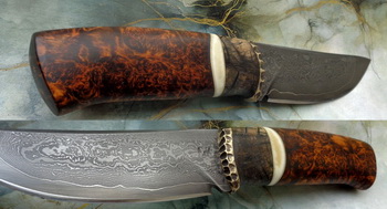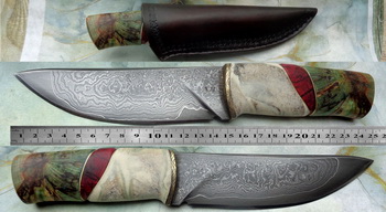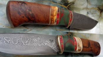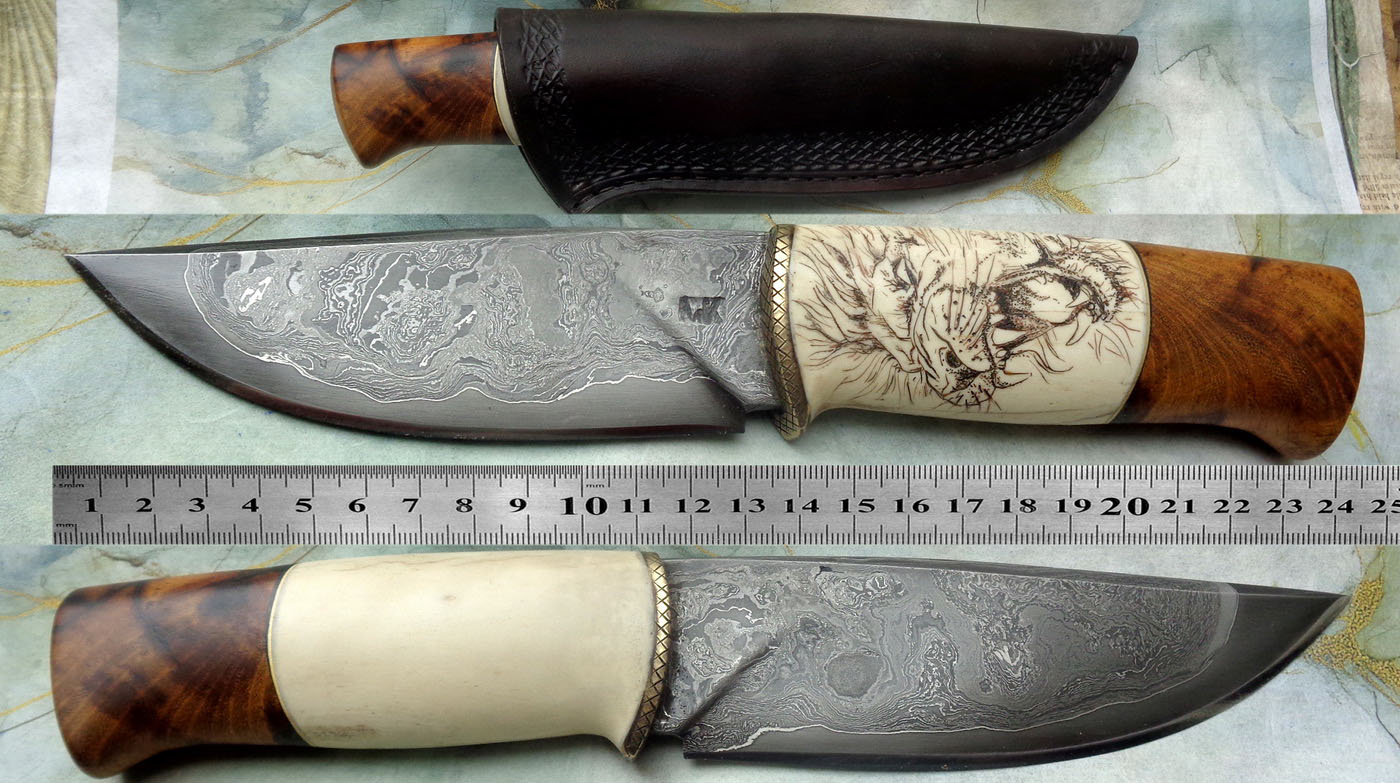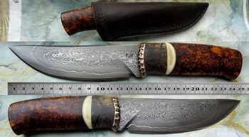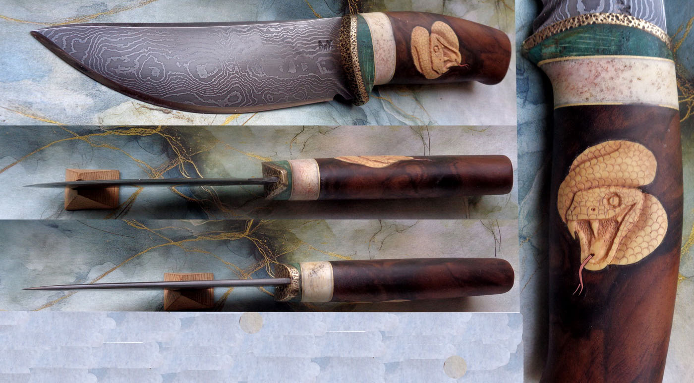 Острие – Мозайкова дамаска стомана. За режещ ръб съм спретнал див дамаск изкован от Шх15 и 75Ni8. Зоново калено с обмазка. 58-60 HRC.