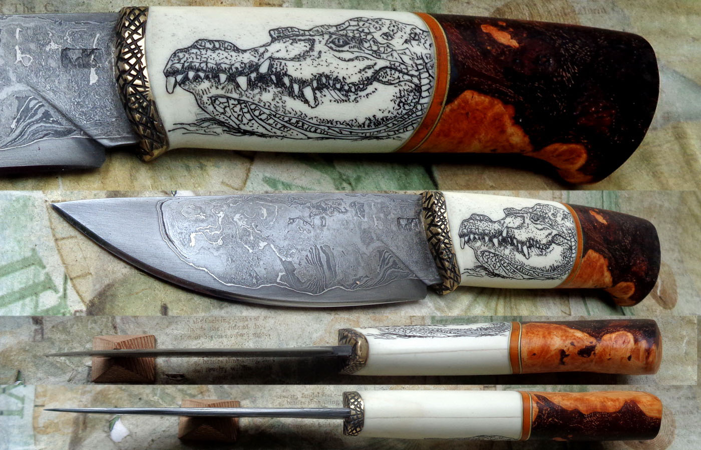 Дръжка – Абанос, кост, фибър, еленов рог и орех. Инкрустации – бронз, мед и алуминий.