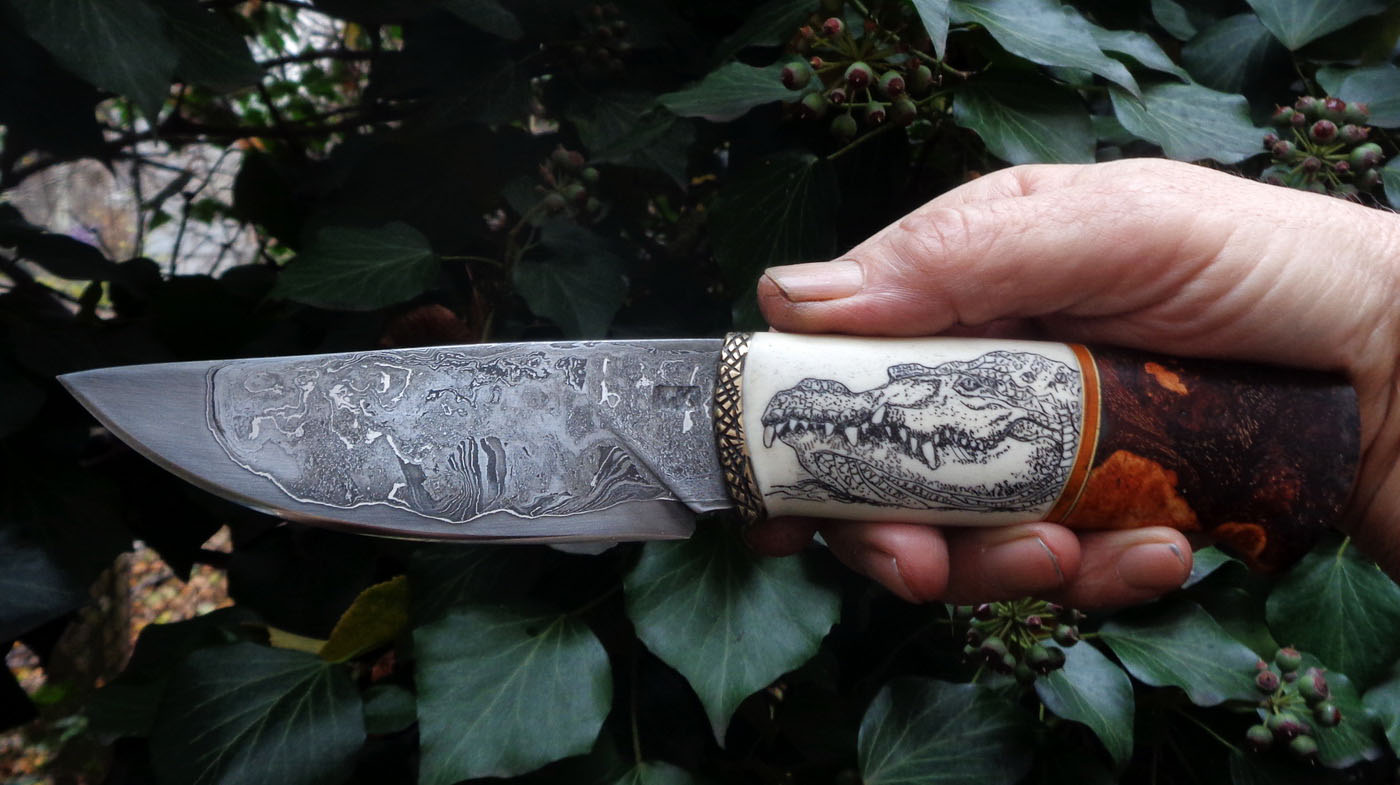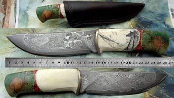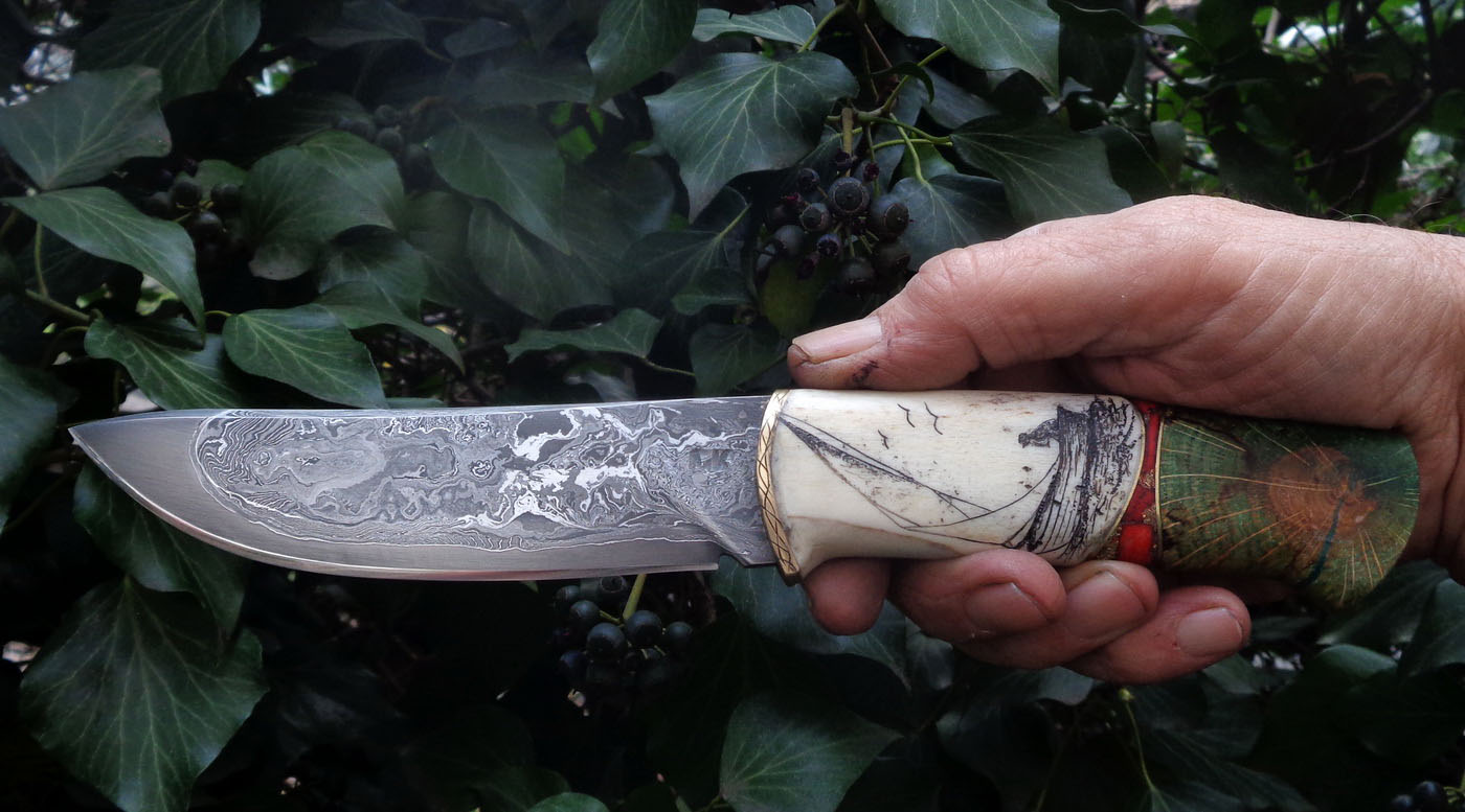 Дръжка – Биволски рог, мамутски кътник, мозайка от дърво и ясен обработен с нажежена пара под високо налягане. (декинг технология).