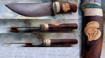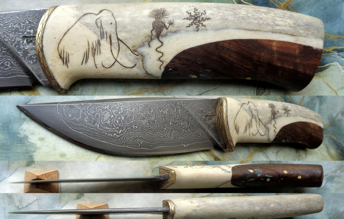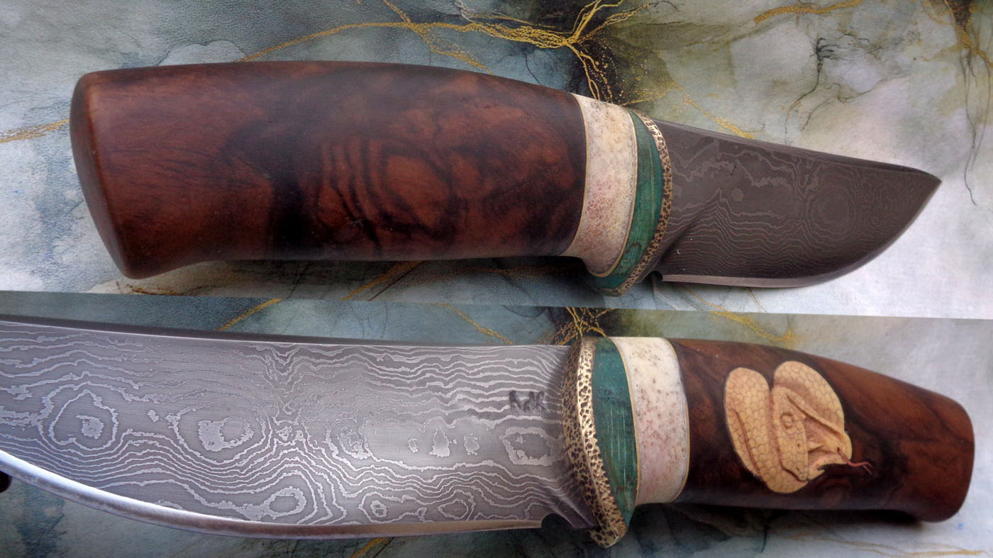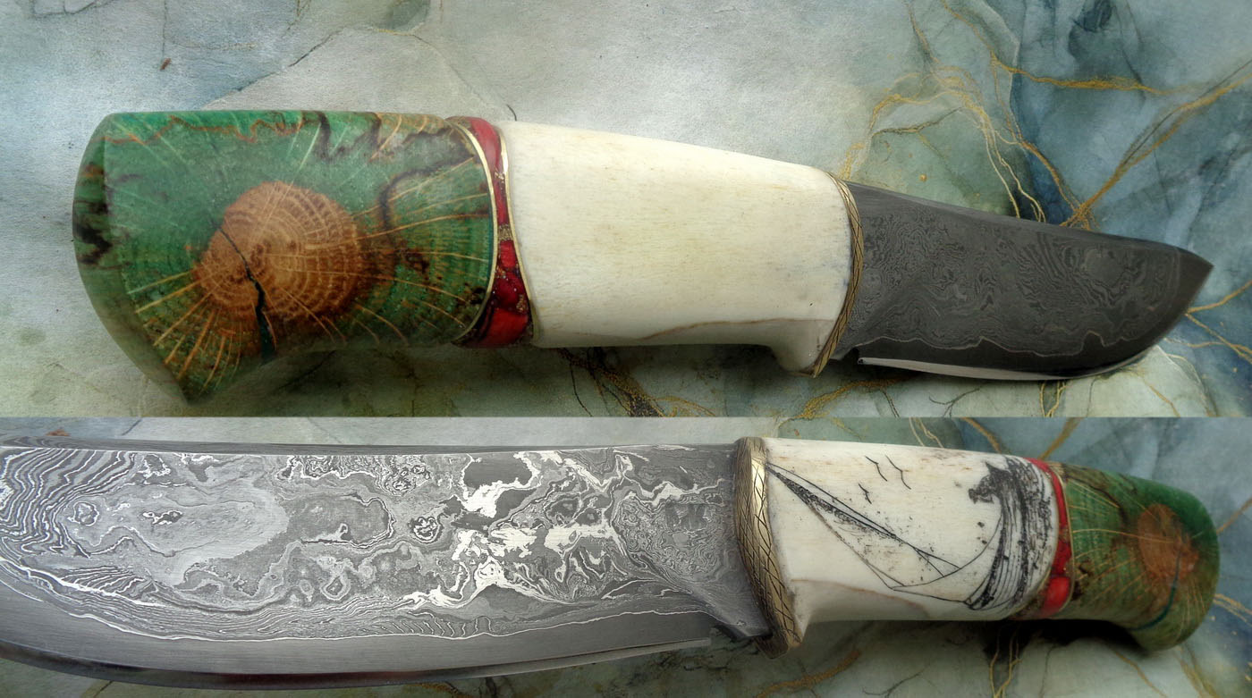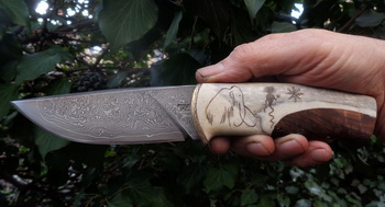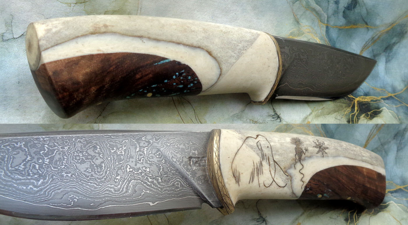 Дръжка – Гравиран еленов рог и леко червив корен от орех.Малко тюркоаз в дупките. Накрая 4 бронзови щифта, вкарани в различни посоки, за да подсигурят връзката между ореха и рогчето.