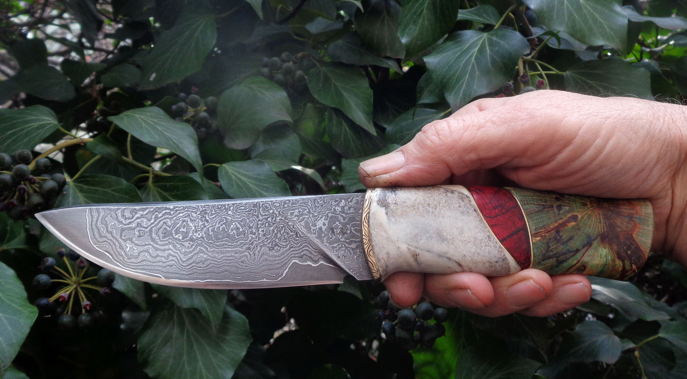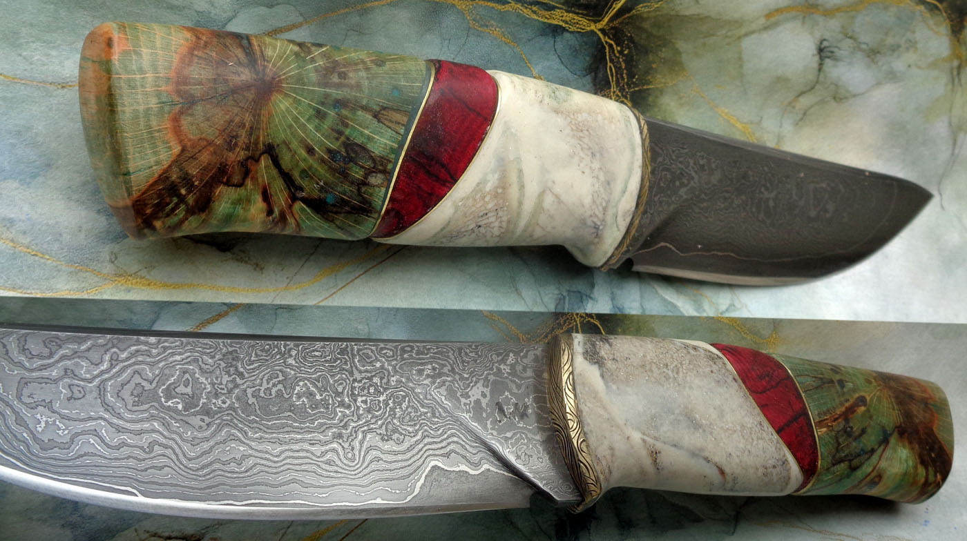 Дръжка – Черен габър, стабилизирана в червено и синьо бивна от мамут.
