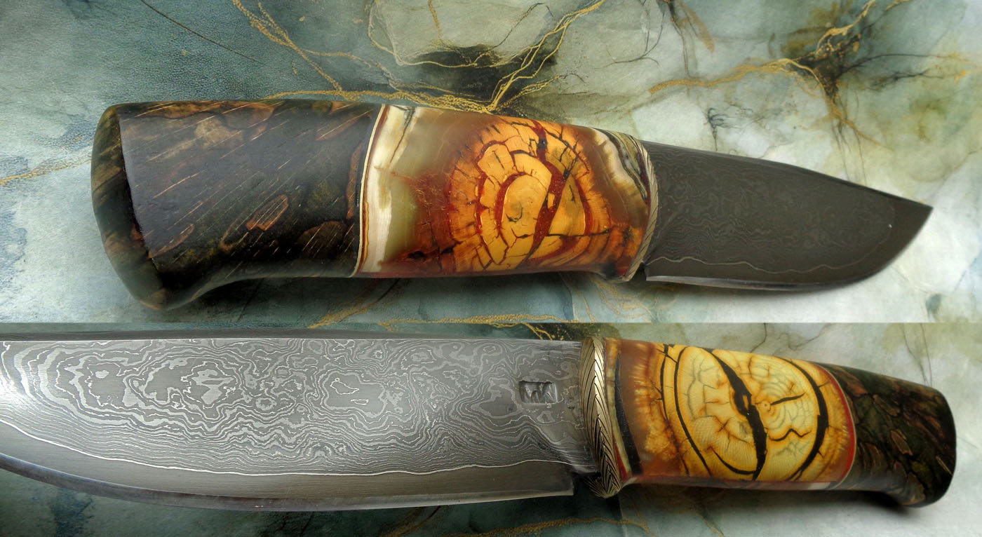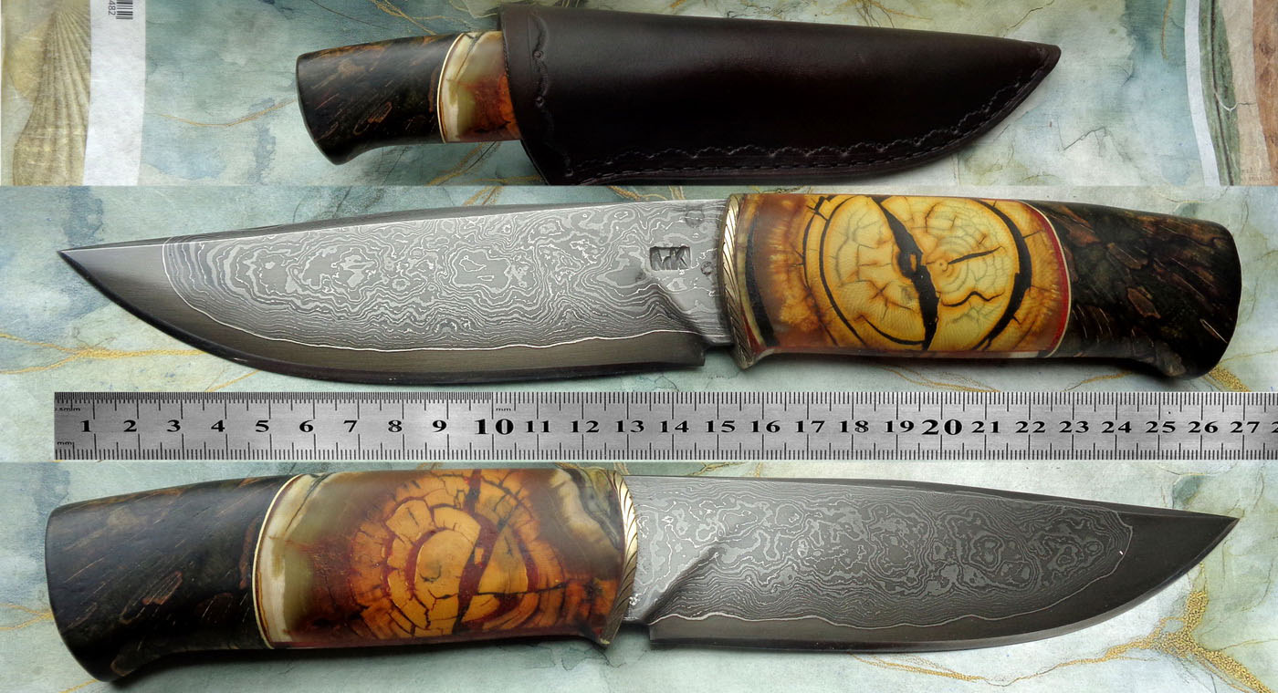 Острие – Фосилна дамаска стомана. Режещ ръб Шх15. Зоново калено с обмазка. 59-61 HRC.