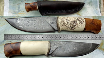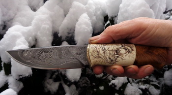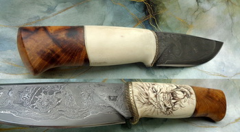 Дръжка – Гравирана кост и корен от дъб.