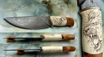 Дръжка – Гравирана кост, Кътник от мамут и дрян съхнал на корен.