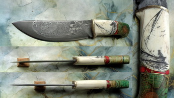 Дръжка – Бивна от мамут, мозайка от кост, и черен габър.