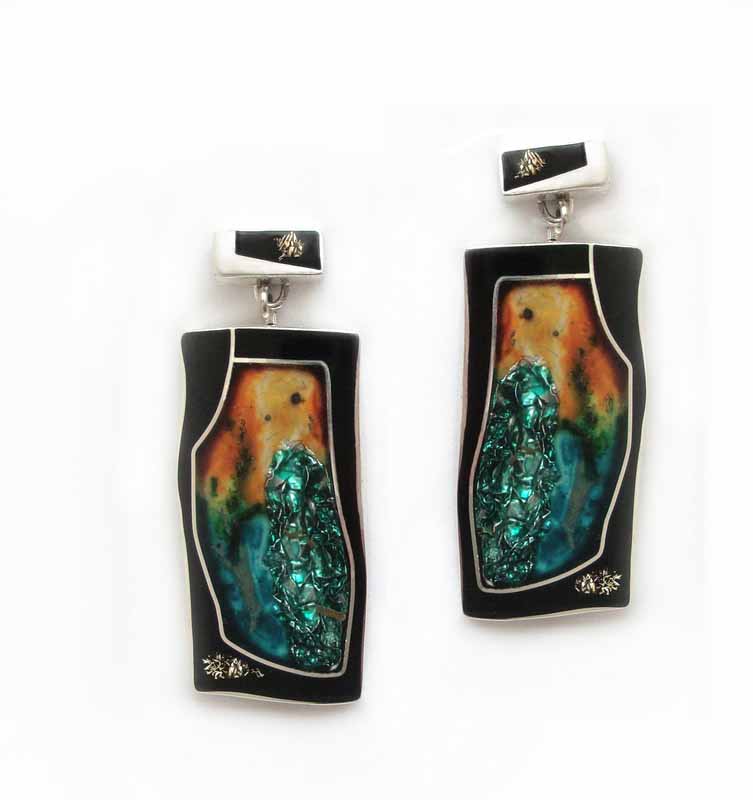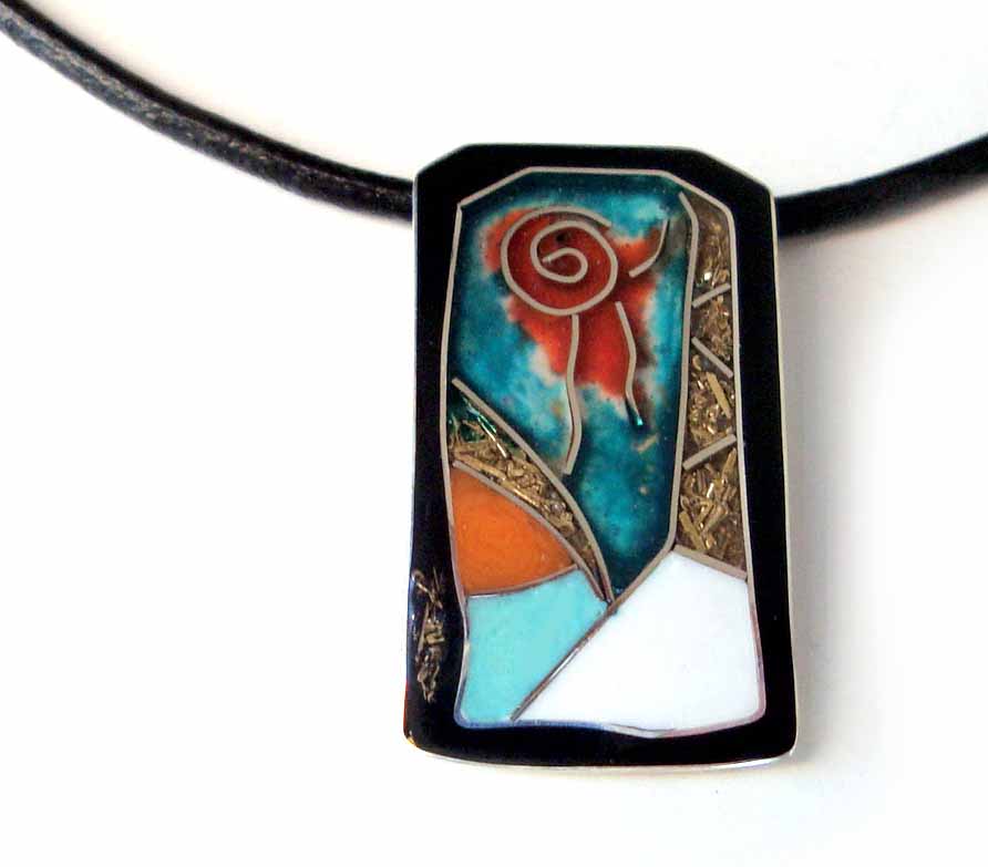 Колие на естествена кожа, гривна, висящи обеци на щифт, брошка и пръстен. Витрал и полимери.