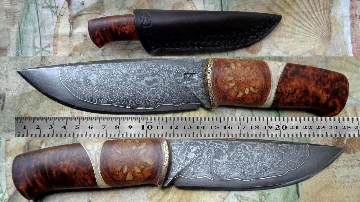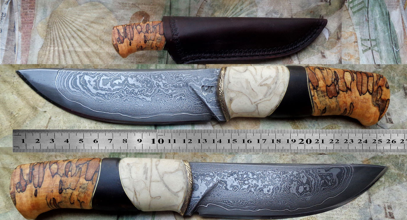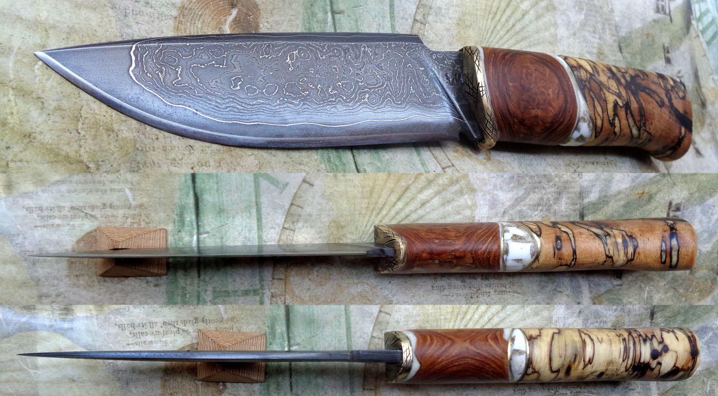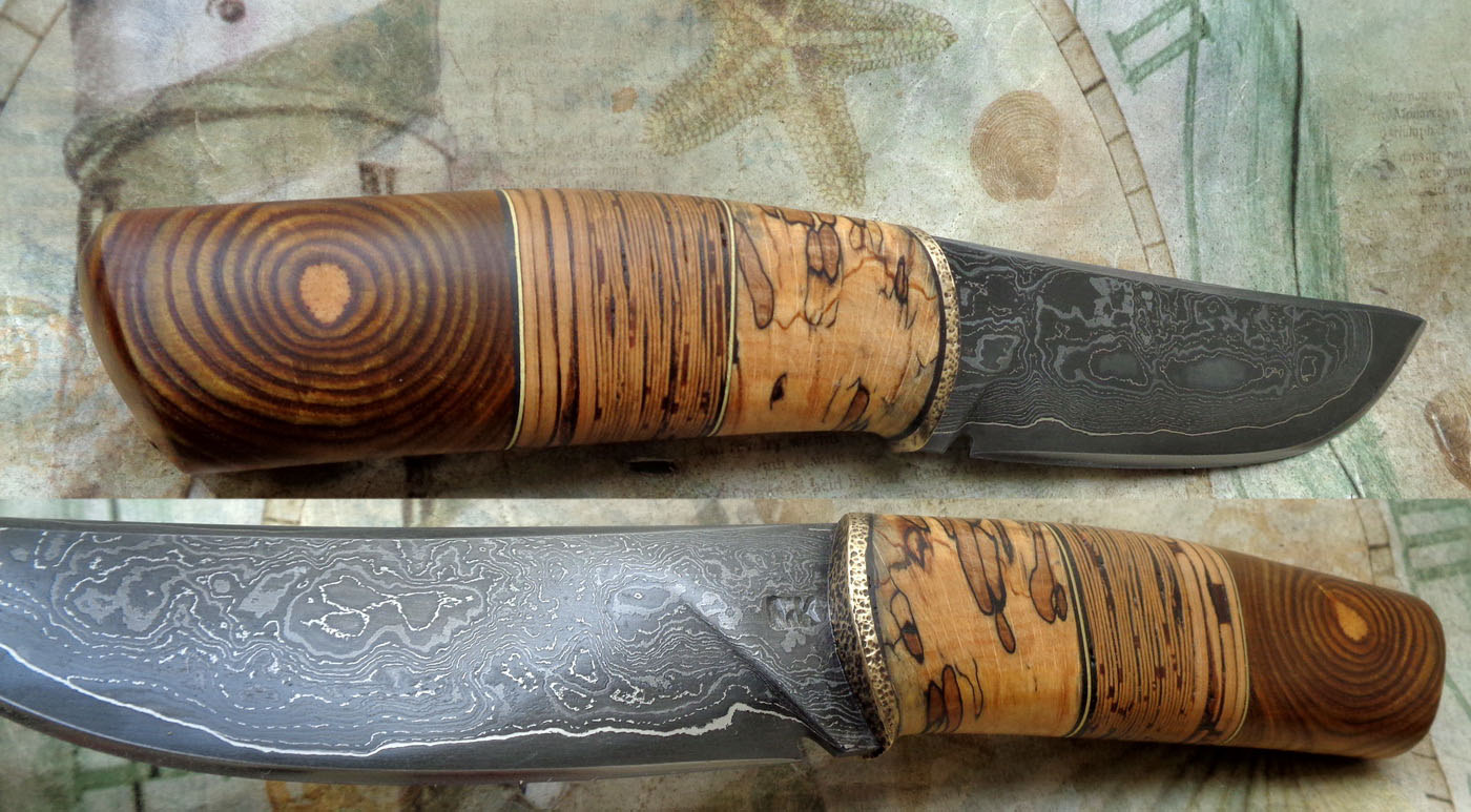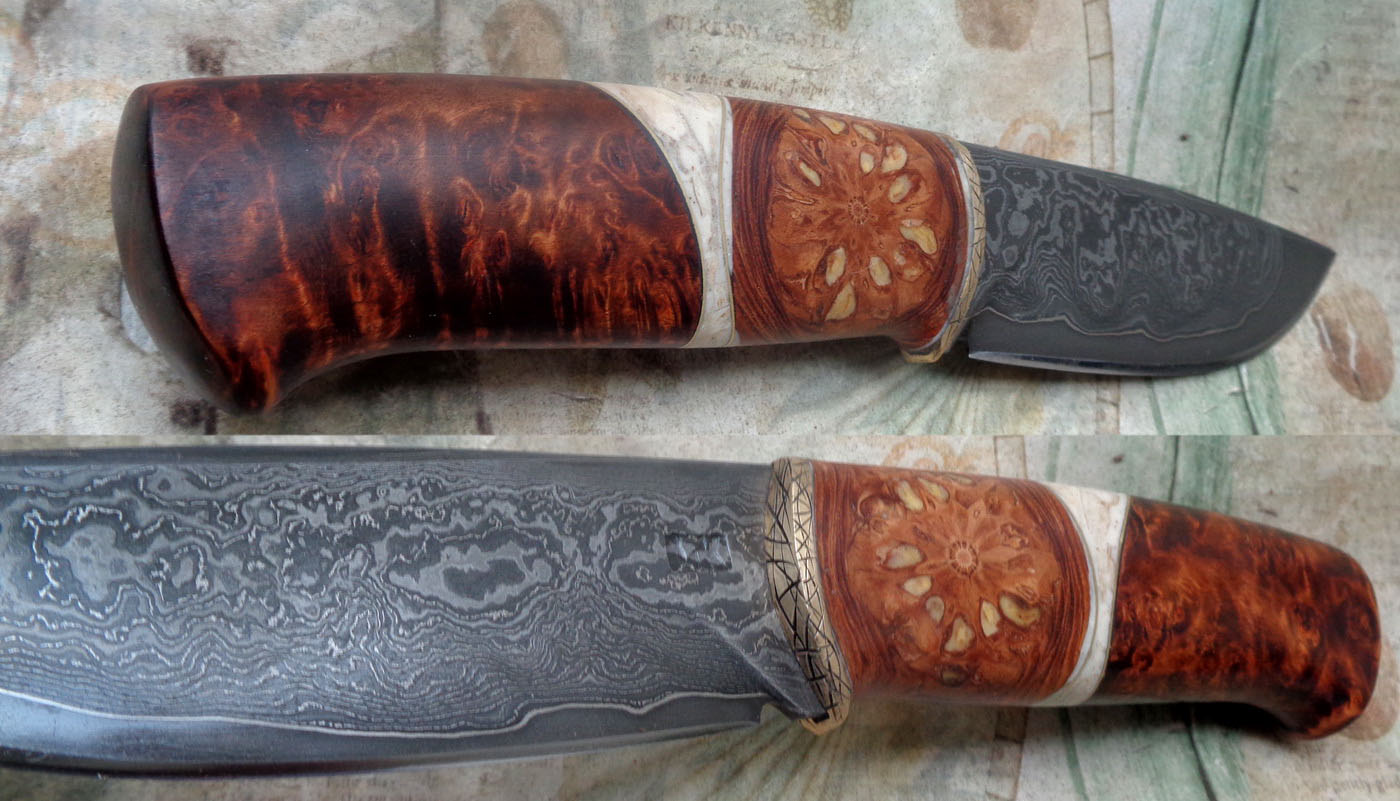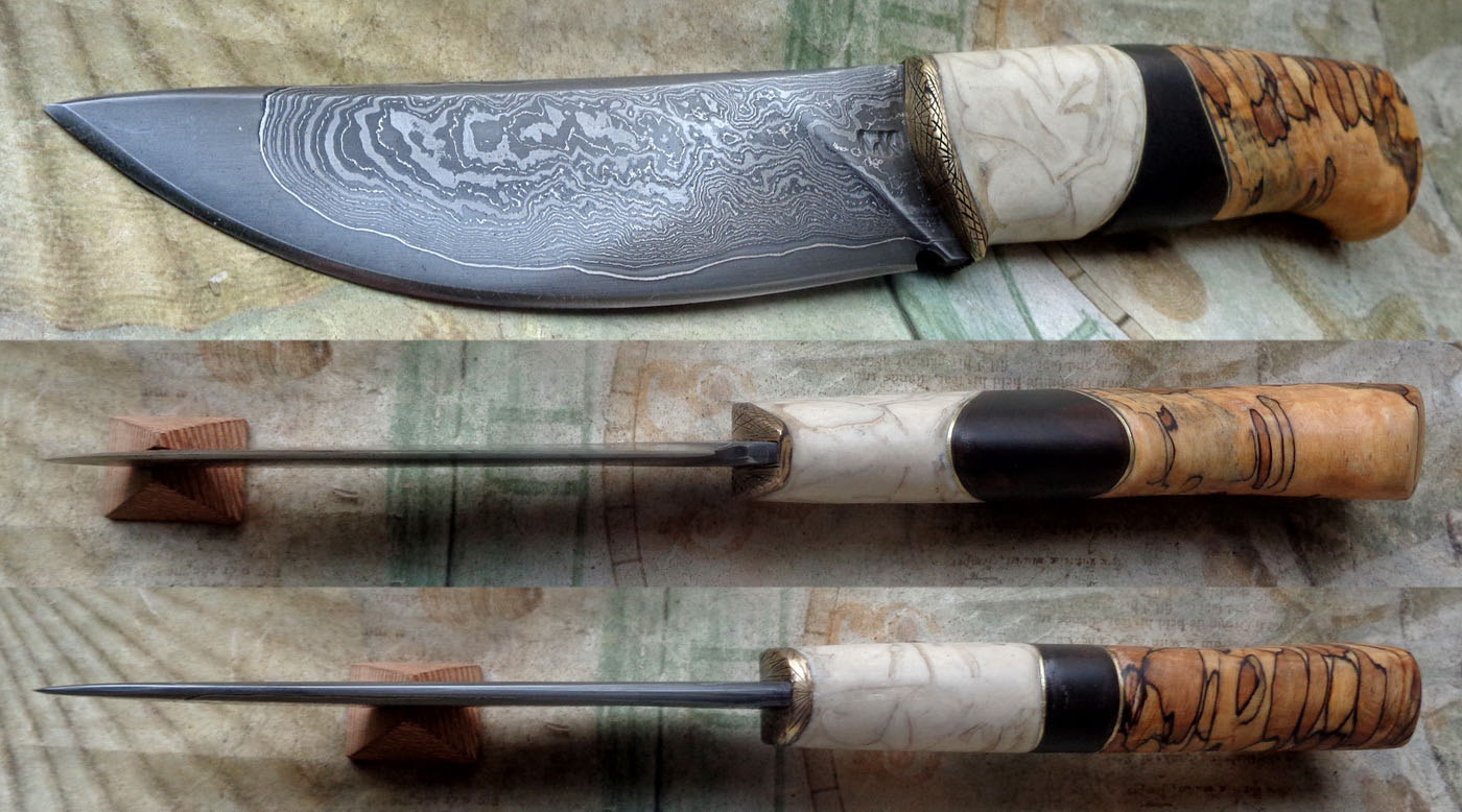 Острие – Мозайкова дамаска стомана. За режещ ръб съм спретнал див дамаск изкован от Шх15 и 75Ni8. Зоново калено с обмазка. 58-60 HRC.