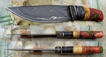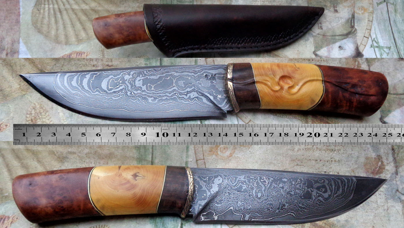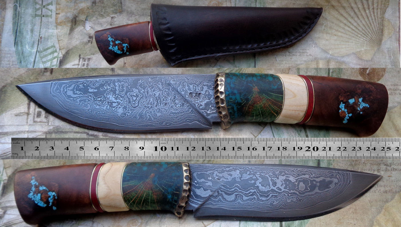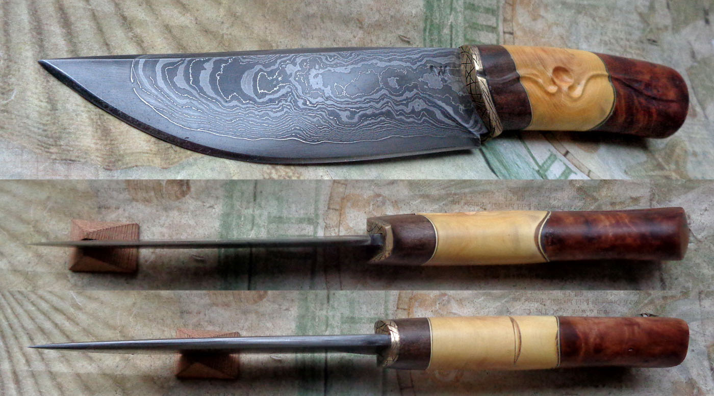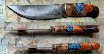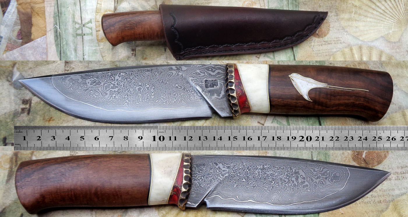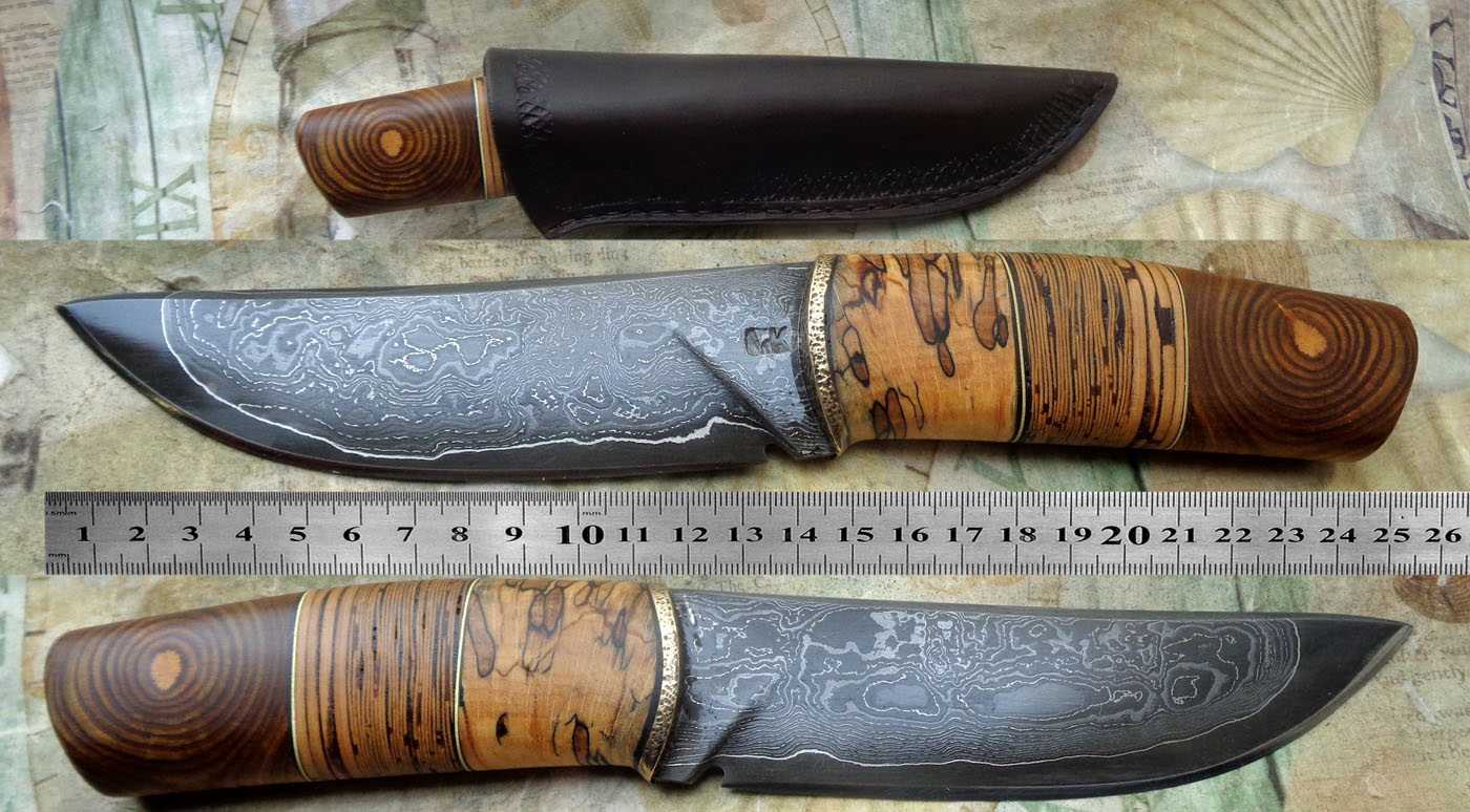 Острие – Мозайкова дамаска стомана. За режещ ръб съм спретнал див дамаск изкован от Шх15 и 75Ni8. Зоново калено с обмазка. 58-60 HRC.