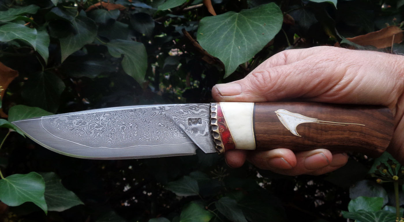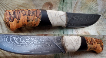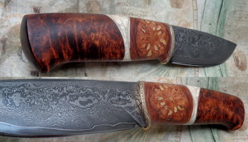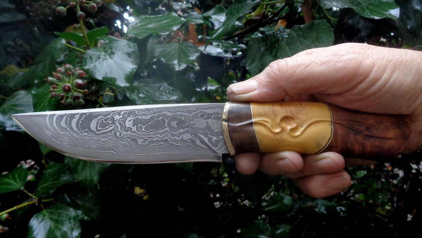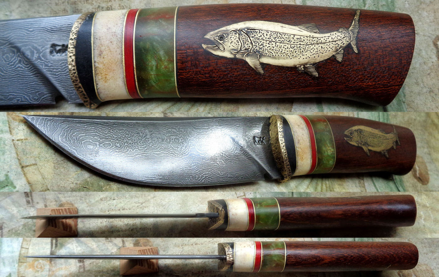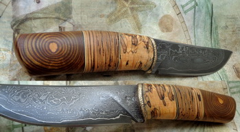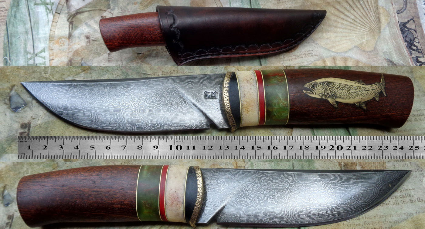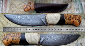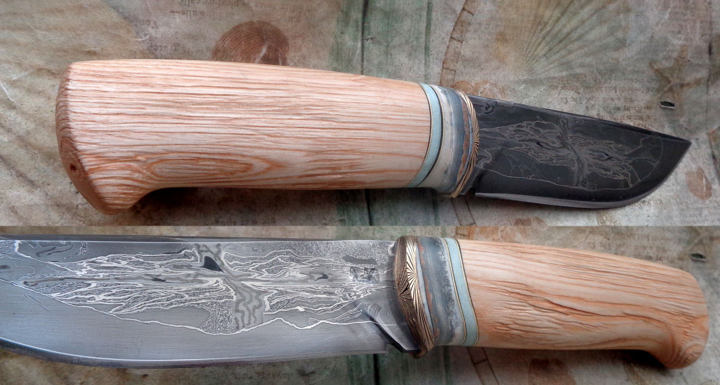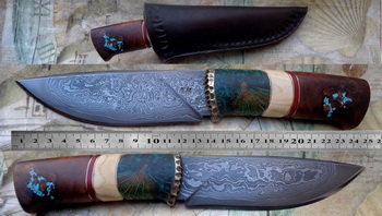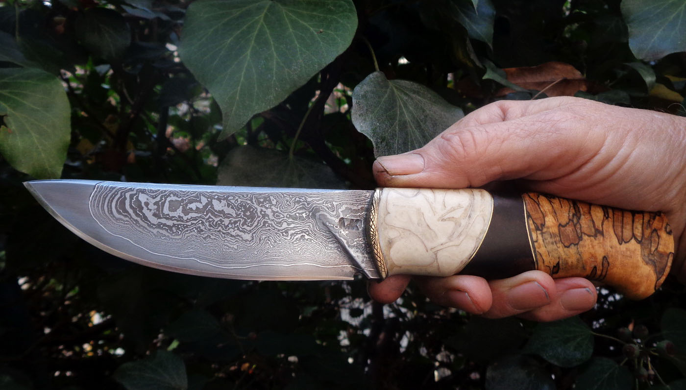 Острие – Мозайкова дамаска стомана. За режещ ръб съм спретнал див дамаск изкован от Шх15 и 75Ni8. Зоново калено с обмазка. 58-60 HRC.