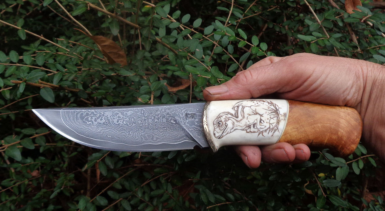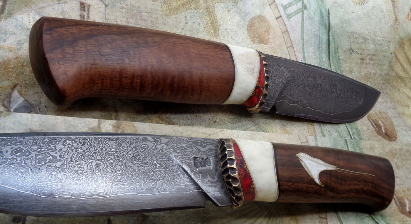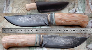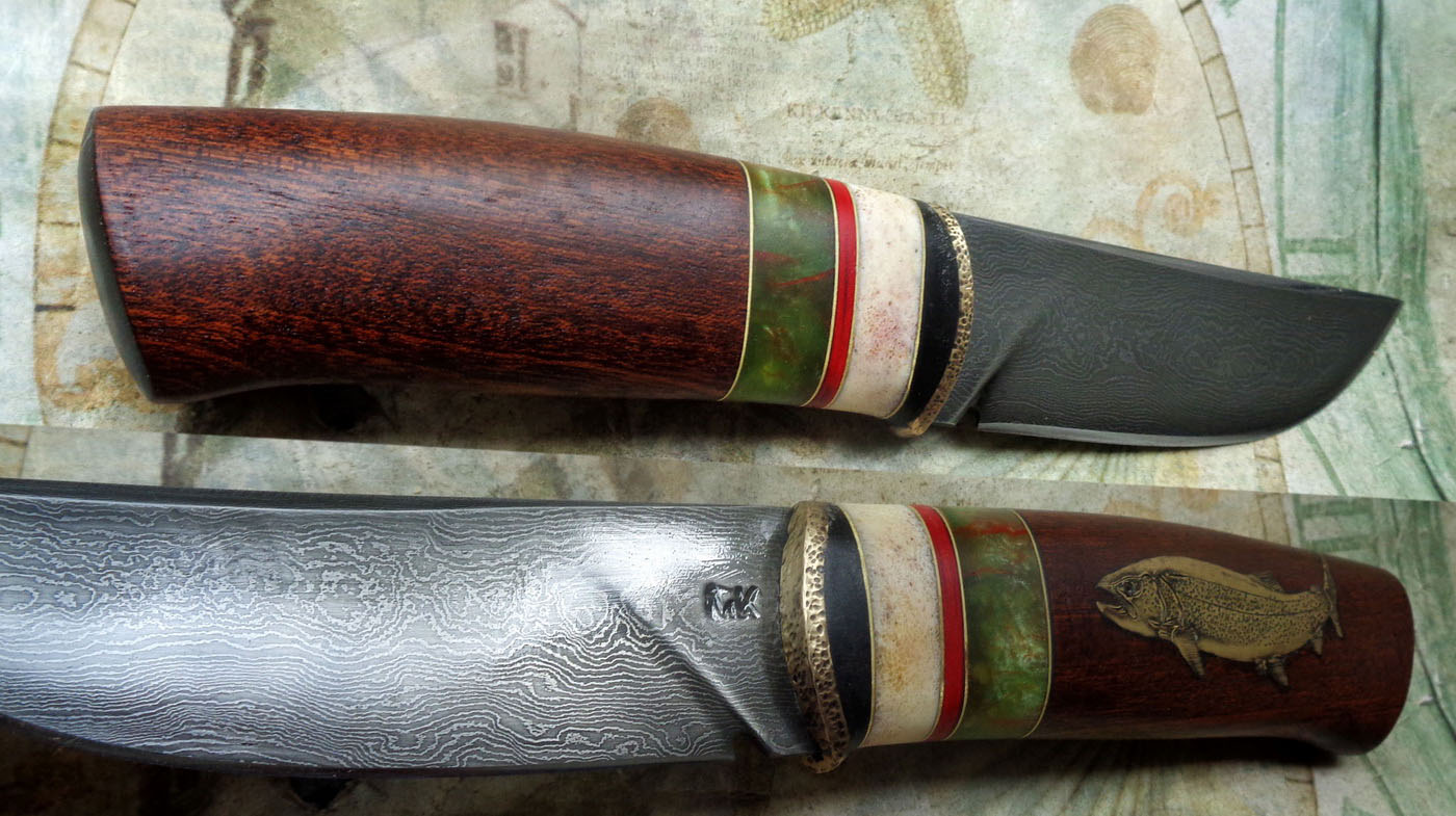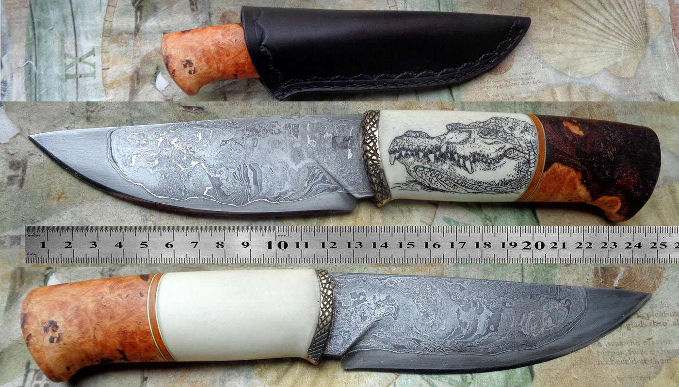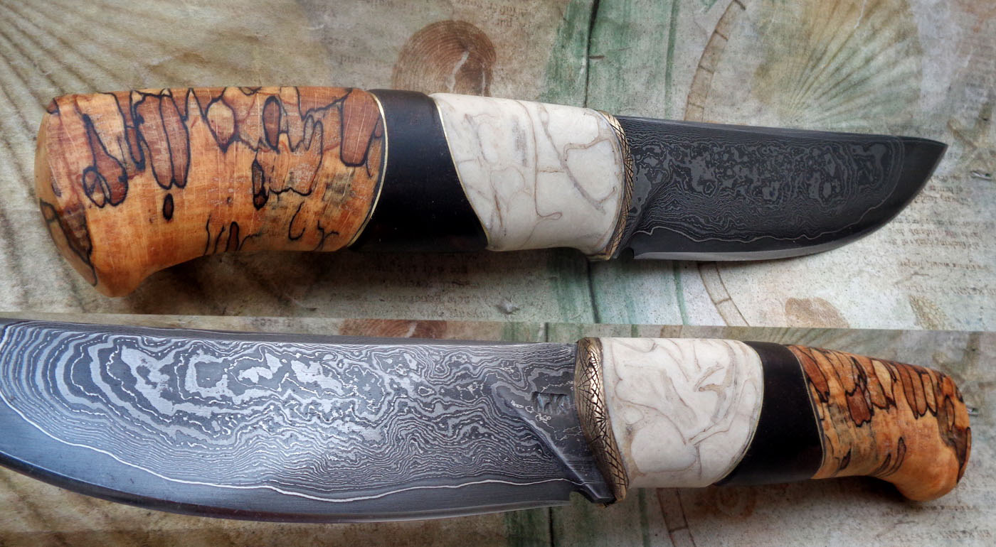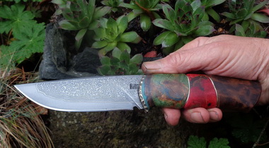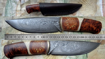 Острие – Мозайкова дамаска стомана. За режещ ръб съм спретнал див дамаск изкован от Шх15 и 75Ni8. Зоново калено с обмазка. 58-60 HRC.
