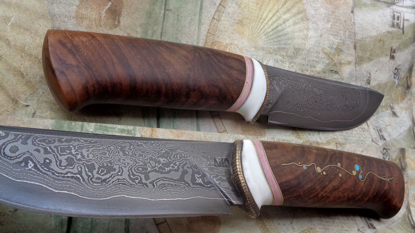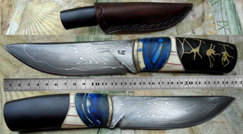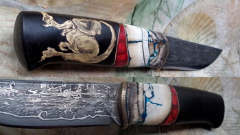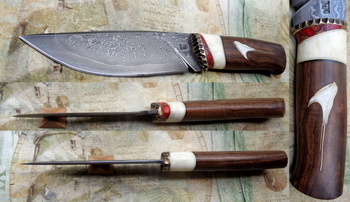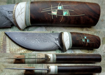 Дръжка – Абанос, кост, фибър, еленов рог и орех. Инкрустации – бронз, мед и алуминий.