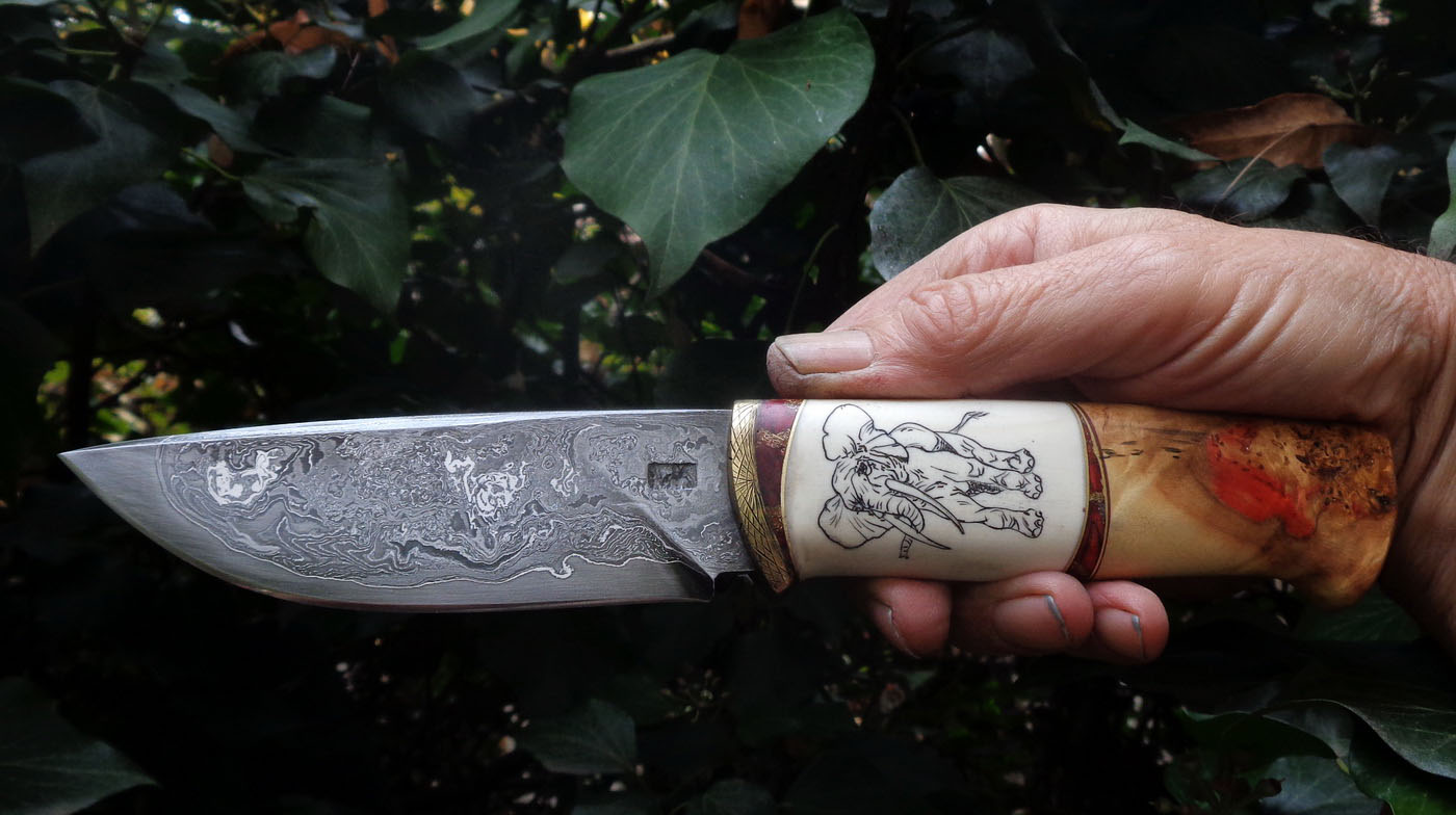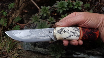 Дръжка – Биволски рог, мамутски кътник, мозайка от дърво и ясен обработен с нажежена пара под високо налягане. (декинг технология).