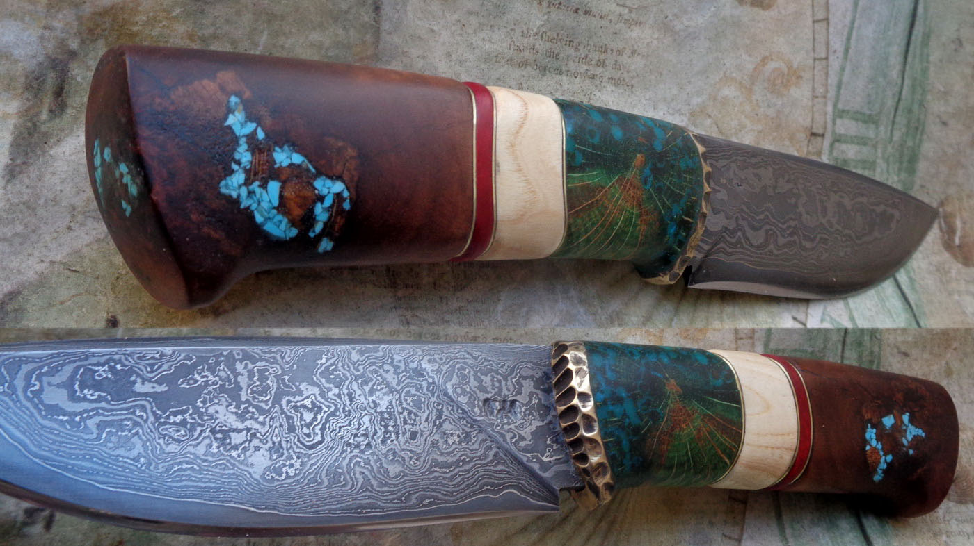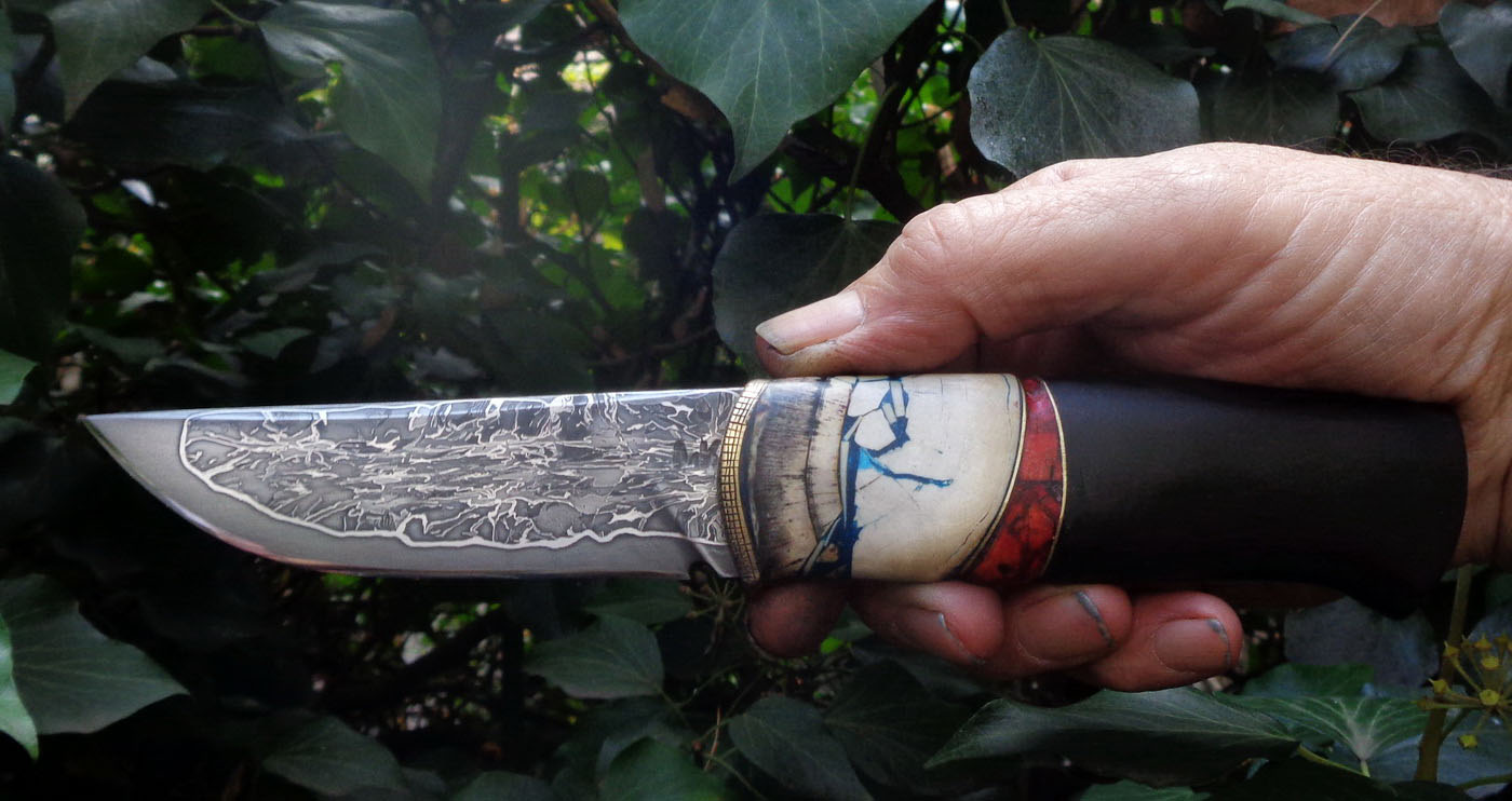 Дръжка – Стабилизирани дъб в напречен разрез, ясен, фибър и дрян, съхнал на корен. Малко тюркоазена мозайка в дупките на дряна.