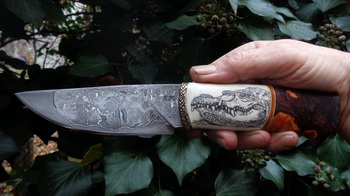 Дръжка – Бивна от мамут, фибър и ясен с изваден фладер.
