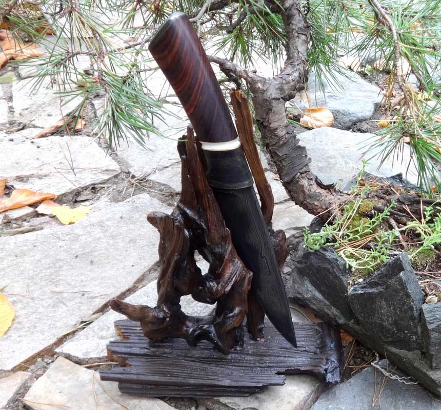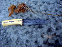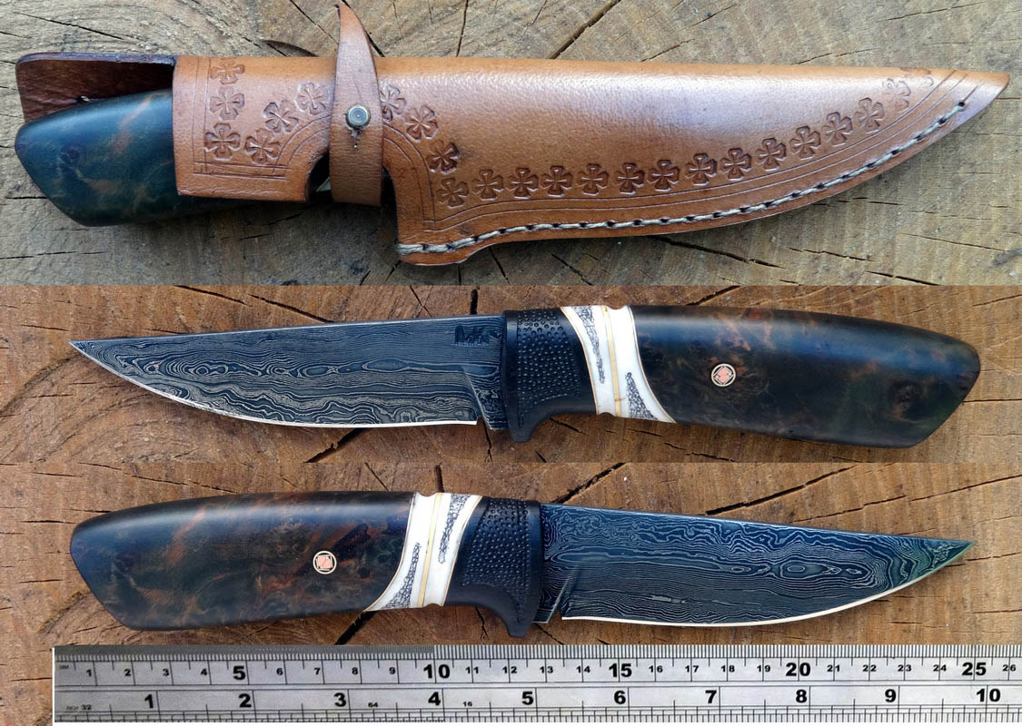- ковано от ШХ15, 65Г и ленти от банциг - 214 слоя дамаск. Зоново калено. Дръжка