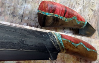- Ръчно кована мозайкова дамаска стомана. За режещ ръб е ламинирана високо въглеродна