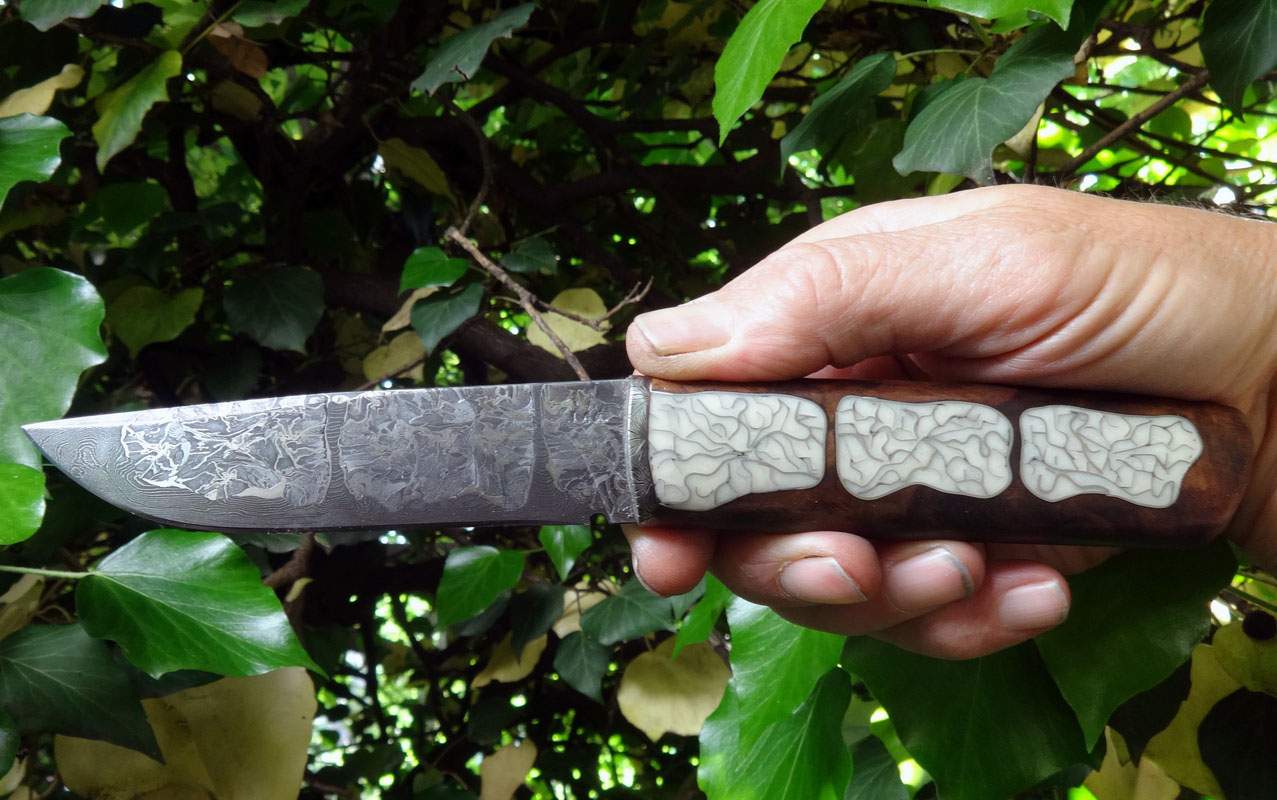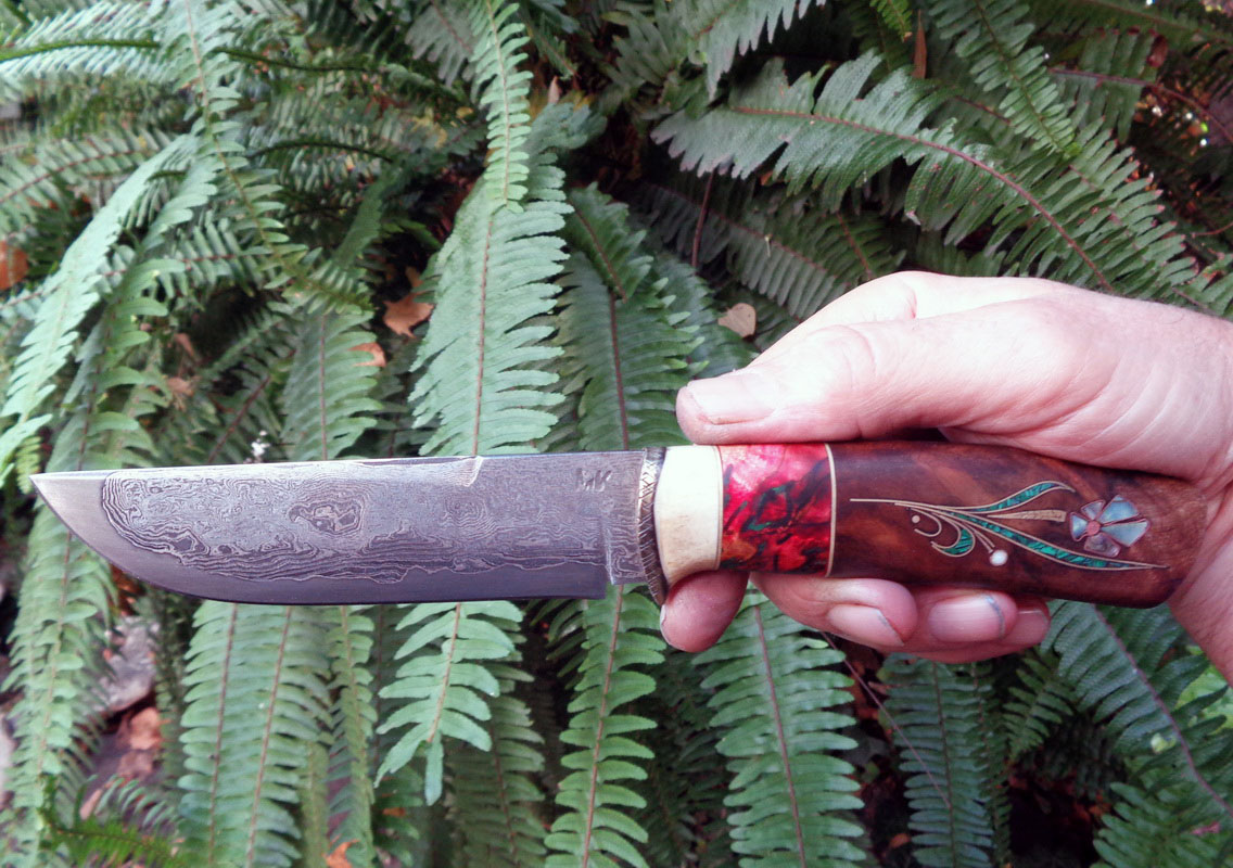 - мозайкова дамаска стомана. За режещ ръб е ламинирана дамаска стомана кована