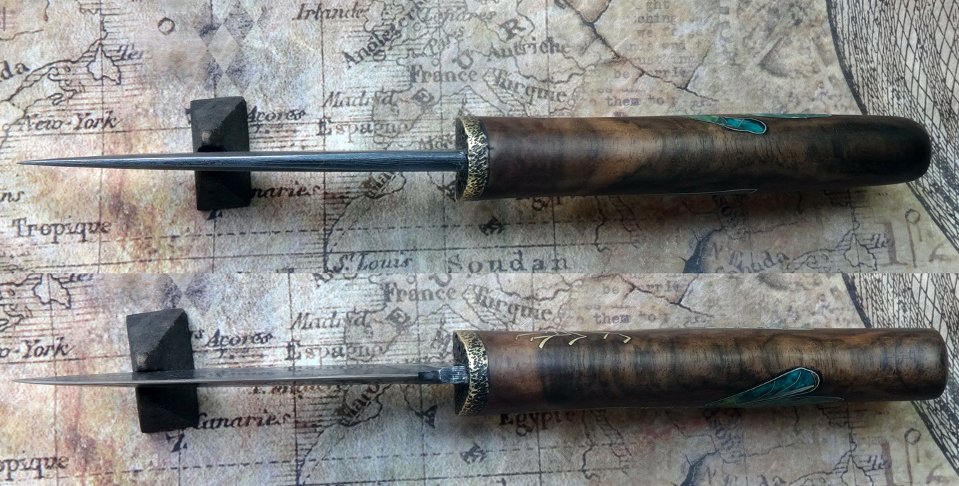 - мозайкова дамаска стомана. За режещ ръб е ламинирана Шх15 (52100). Зоново калено.