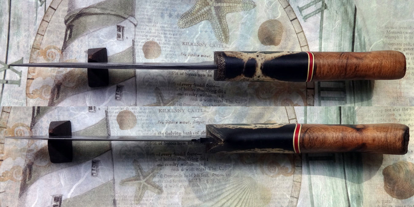 - Фосилна дамаска стомана. Режещ ръб - високо въглеродна инструментална стомана