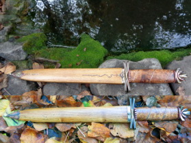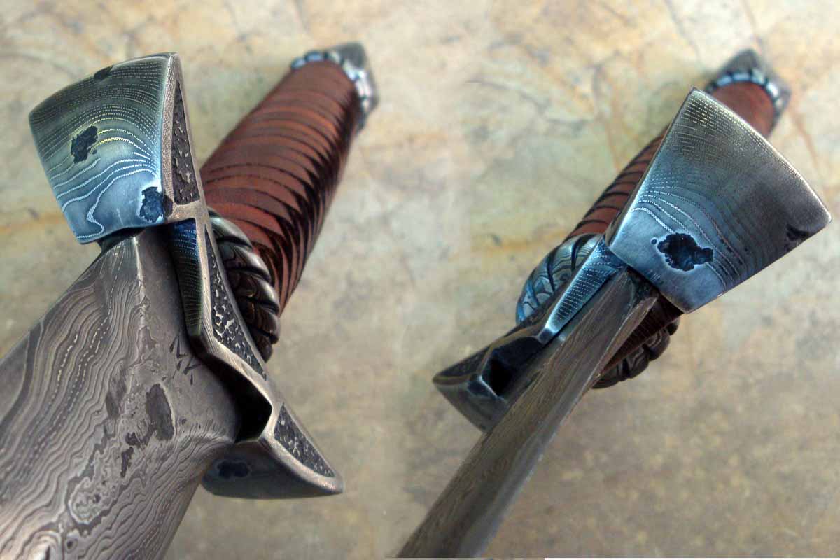 - Пушен дъб с обков от дамаска стомана и кожени оплетки. Окачане