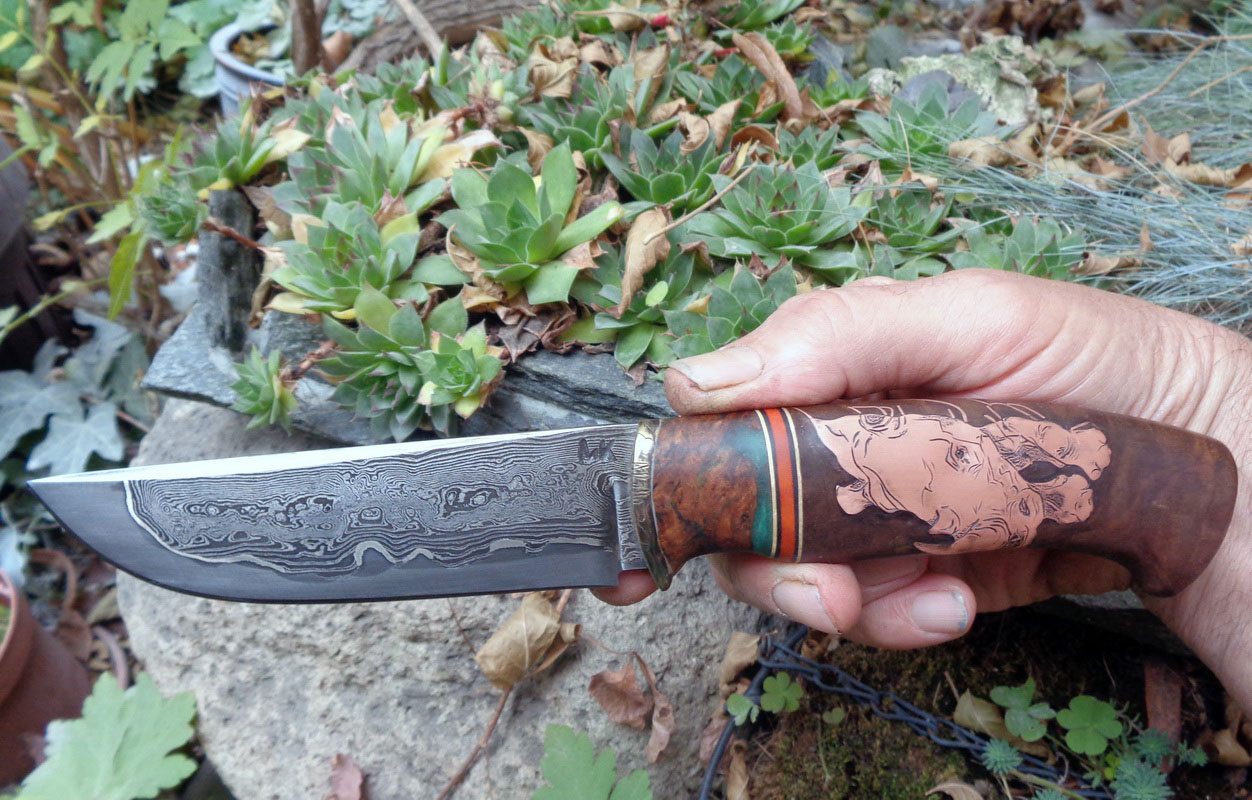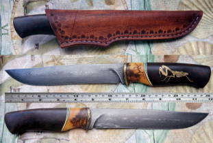 - Мозайкова дамаска стомана. За режещ ръб е ламинирана високо въглеродна инструментална