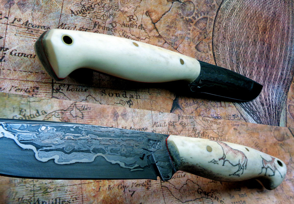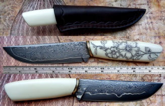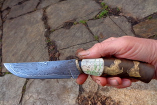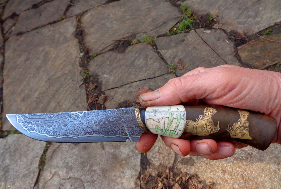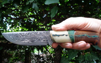 - Фосилна дамаска стомана. За режещ ръб е ламинирана Шх15 (52100). Зоново калено.