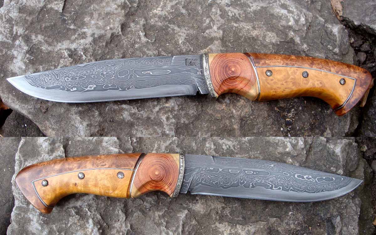 Инкрустации - неръждаема стомана и стерлингова сплав. Гард - торсирана дамаска