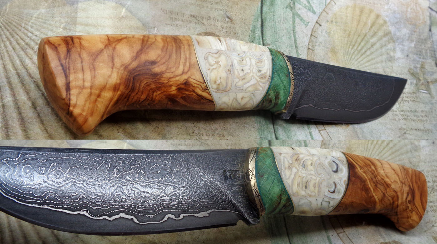 Острие – Мозайкова дамаска стомана. За режещ ръб съм спретнал див дамаск изкован от Шх15 и 75Ni8. Зоново калено с обмазка. 58-60 HRC.